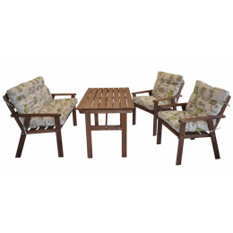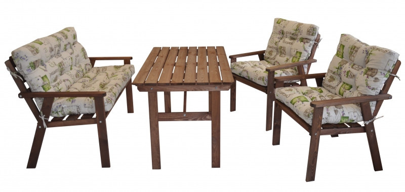 Sestava zahradního nábytku vyrobená z masivního dřeva borovice. | Zahradní sestava Nordic je díky promyšlené konstrukci křesel a pohovky velice pohodlná. K tomu nemalou měrou přispívají i kvalitní polstry vyrobené v České republice. Díky výšce stolu 72 cm můžete sestavu použít i jako jídelní zahradní nábytek. Velikost křesla je 58x58x78 cm. Nosnost křesla je 110 kg. Velikost pohovky je 115x58x78 cm. Nosnost pohovky je 160 kg. Velikost stolku je 110x75x72 cm. Sestavu dodáváme lakovanou v hnědé barvě. Polstry na tuto sedací soupravu jsou vyrobeny v České republice. Polstry jsouvyrobeny z kvalitní látky a vyznačují se vysokou kvalitou zpracování.Polstry pro nás vyrábí firma AXIN Cuschions s.r.o., která zaměstnávávýhradně místní vyučené švadleny z České republiky. Tímto způsobem sesnažíme podporovat výrobu a zaměstnanost v naší republice. Náplň polstrů je drcený molitan a polstry lze prát ručně na 40o C.