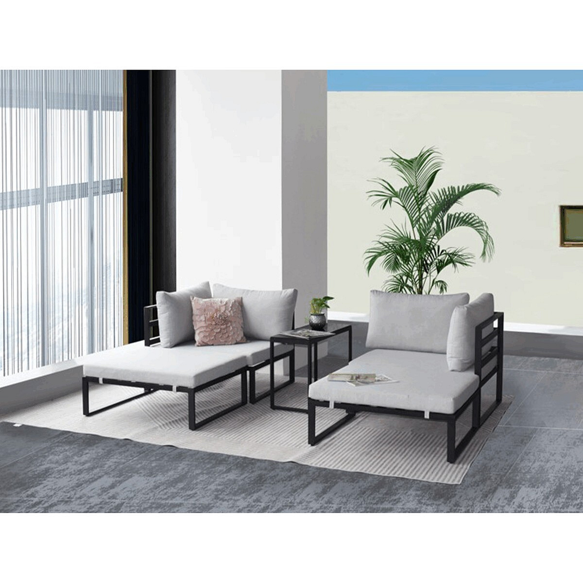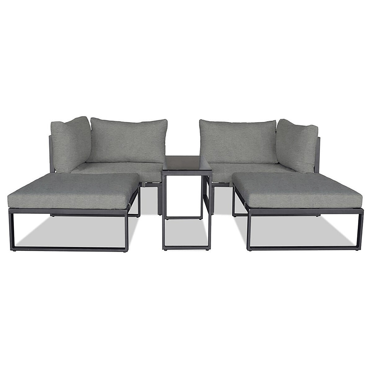 Moderní zahradní sestava značky Autronic je dokonalým řešením pro váš venkovní prostor. Sestava je multifunkční a umožňuje variabilní uspořádání podle vašich potřeb. Pevná kovová konstrukce s práškovou povrchovou úpravou v antracitových barvách je doplněna pohodlnými světle šedými látkovými sedáky, které jsou pevně připevněny ke konstrukci pro maximální stabilitu. Deska stolku z tvrzeného skla dodává sestavě elegantní vzhled, zatímco moderní design zaručuje stylový doplněk do vaší zahrady nebo na terasu.