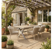 Zahradní židle s hliníkovou konstrukcí v krémovém odstínu nabízí kombinaci lehkosti a pevnosti vhodnou pro venkovní použití. Sedák a opěradlo jsou potažené rychleschnoucí látkou, která je voděodolná a odolná vůči povětrnostním vlivům, což zajišťuje snadnou údržbu a dlouhou životnost i při častém venkovním používání. Design židle je doplněn pohodlnými polštáři v béžové barvě, které zvyšují komfort sezení. Konstrukce je stabilní a zároveň lehká, což usnadňuje manipulaci a přemísťování. Rozměry a nosnost jsou přizpůsobeny běžným potřebám zahradního nábytku.