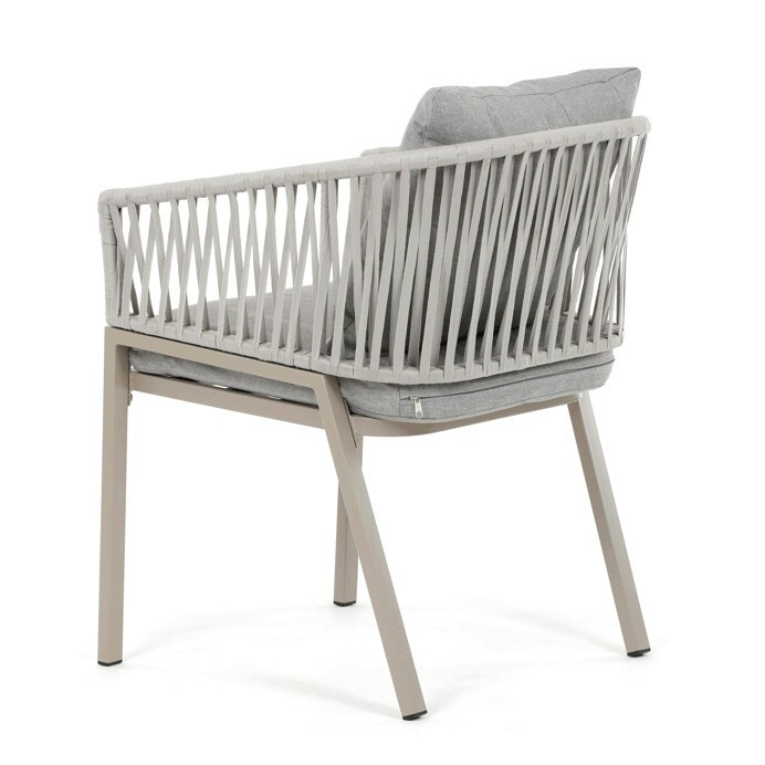 Zahradní židle v béžovém provedení spojuje stabilní kovovou podnož s pohodlným sedákem a opěradlem potaženým látkou v příjemném odstínu. Nadčasový design s jemnými liniemi a otevřenou konstrukcí opěradla vytváří vzdušný vzhled vhodný pro různé venkovní prostory. Židle je navržena tak, aby poskytovala komfort při posezení na terase, zahradě či balkóně, přičemž pevná kovová podnož zajišťuje dlouhodobou stabilitu a odolnost vůči povětrnostním vlivům. Látkový potah je příjemný na dotek a snadno se udržuje, což přispívá k praktickému využití v exteriéru. Celková konstrukce podporuje pohodlnou ergonomii a umožňuje relaxaci v přírodním prostředí.