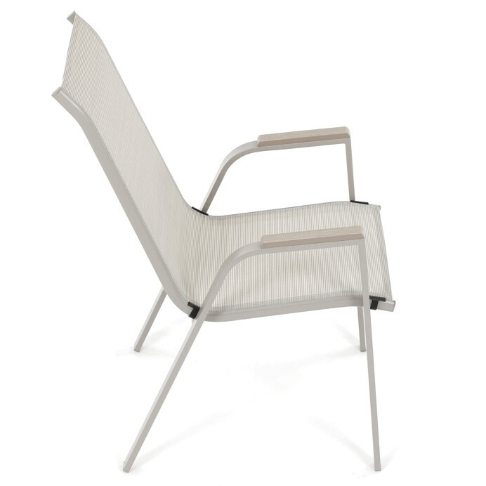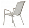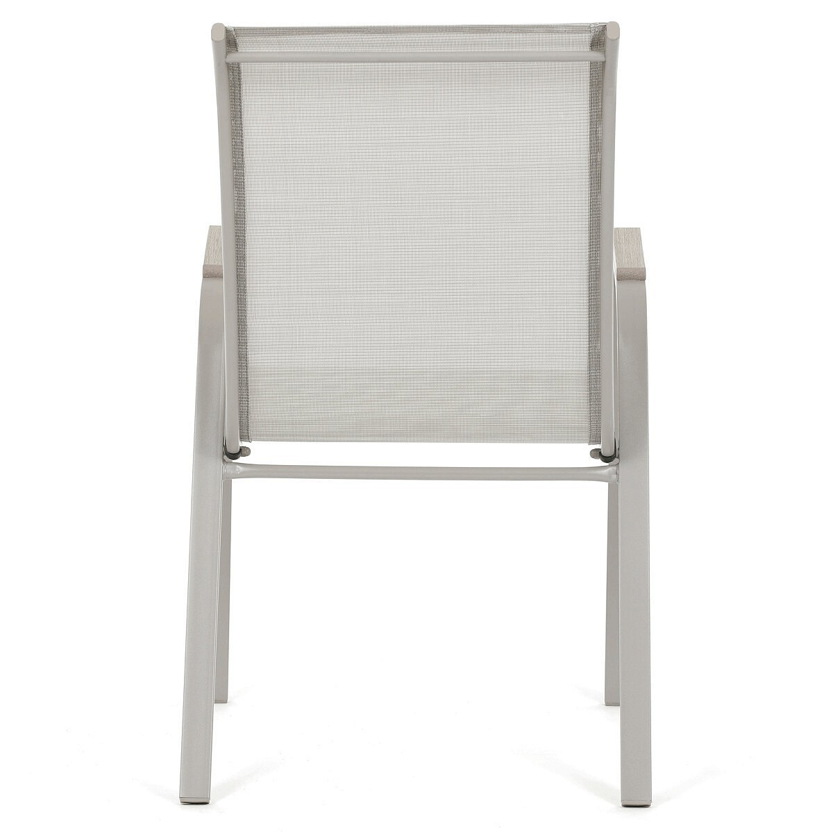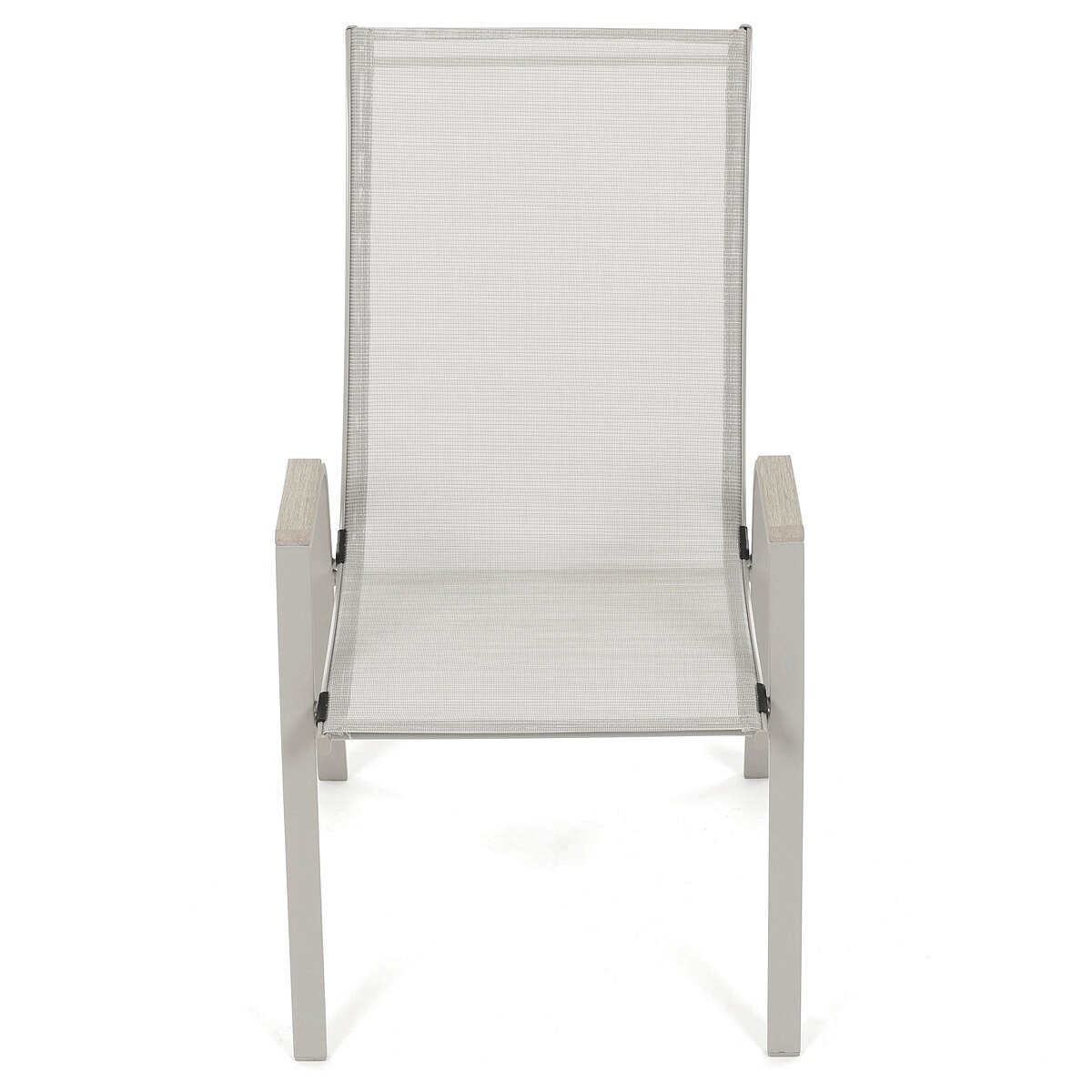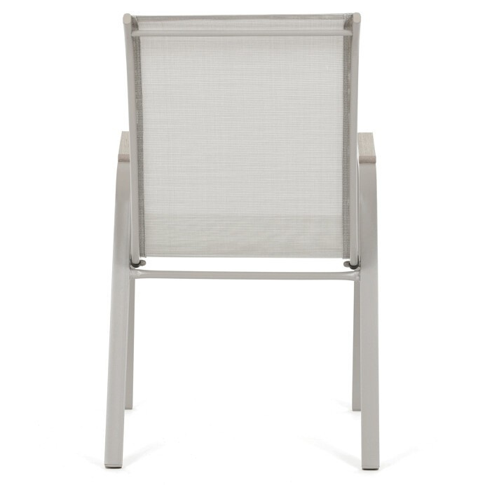 Zahradní židle v béžovém provedení kombinuje pevný rám s polywoodovými područkami v dekoru dubu, které dodávají přírodní vzhled a snadnou údržbu. Sedák a opěradlo jsou potažené odolnou síťovinou, která je příjemná na dotek a umožňuje pohodlné sezení i během teplých dnů díky své prodyšnosti. Konstrukce židle je navržena tak, aby byla stohovatelná, což usnadňuje její skladování a manipulaci. Stabilní kovová podnož zajišťuje bezpečné a pevné opření na různých površích. Díky kombinaci materiálů a designu je židle vhodná pro venkovní použití na terasách, zahradách či balkonech.