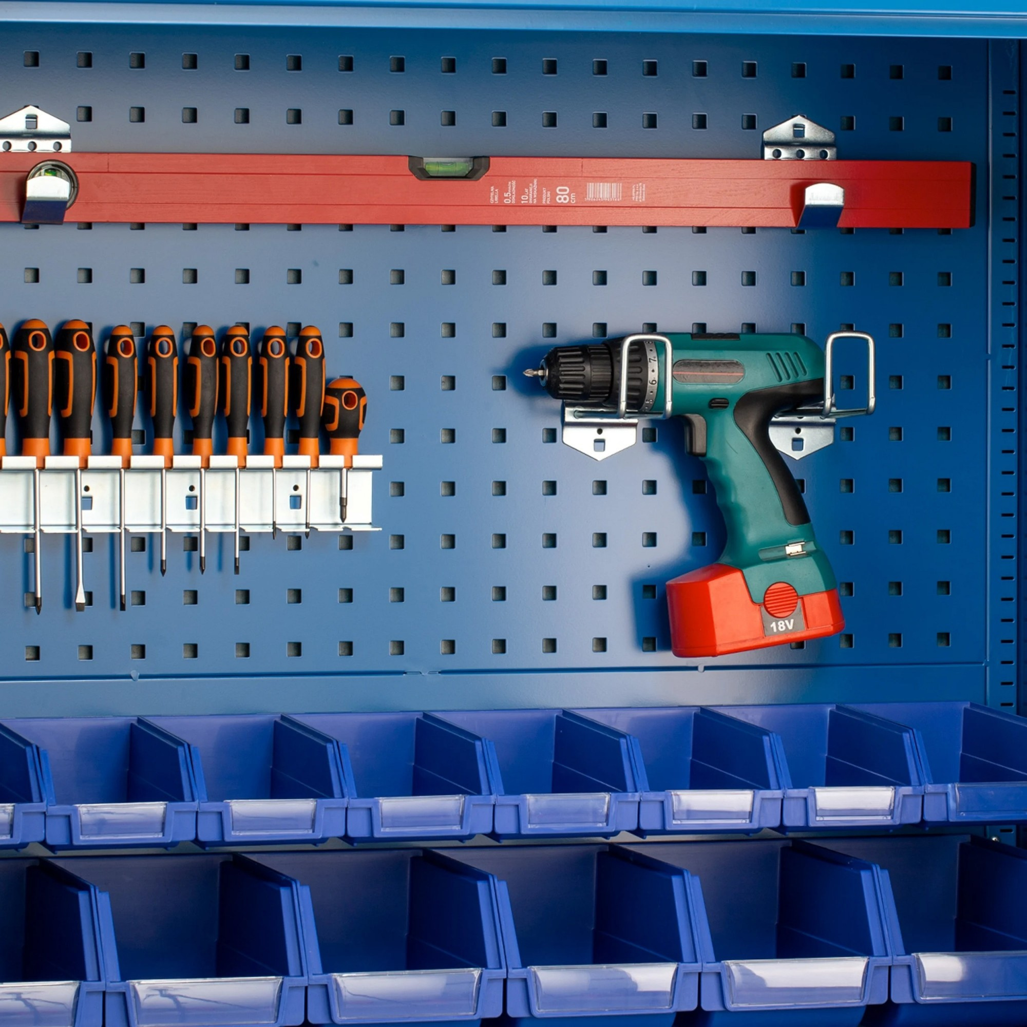 Dílenské skříně BRUNO, DAREK a SZYMON jsou navrženy tak, aby poskytovaly maximální úložný prostor a flexibilitu. S zaoblenými háky můžete využít tento prostor naplno a vytvořit si dílnu, která je nejen funkční, ale i esteticky příjemná.