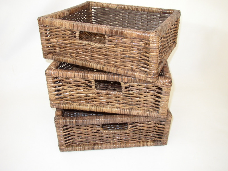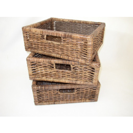 Set tří kusů zásuvek s dřevěnou kostrou a výpletem z přírodního ratanu. > | Velikost zásuvky je 38x31x13,5 cm Praktická ratanová zásuvka na ukládání různých věcí, třídění prádla, dokumentů a podobně. >