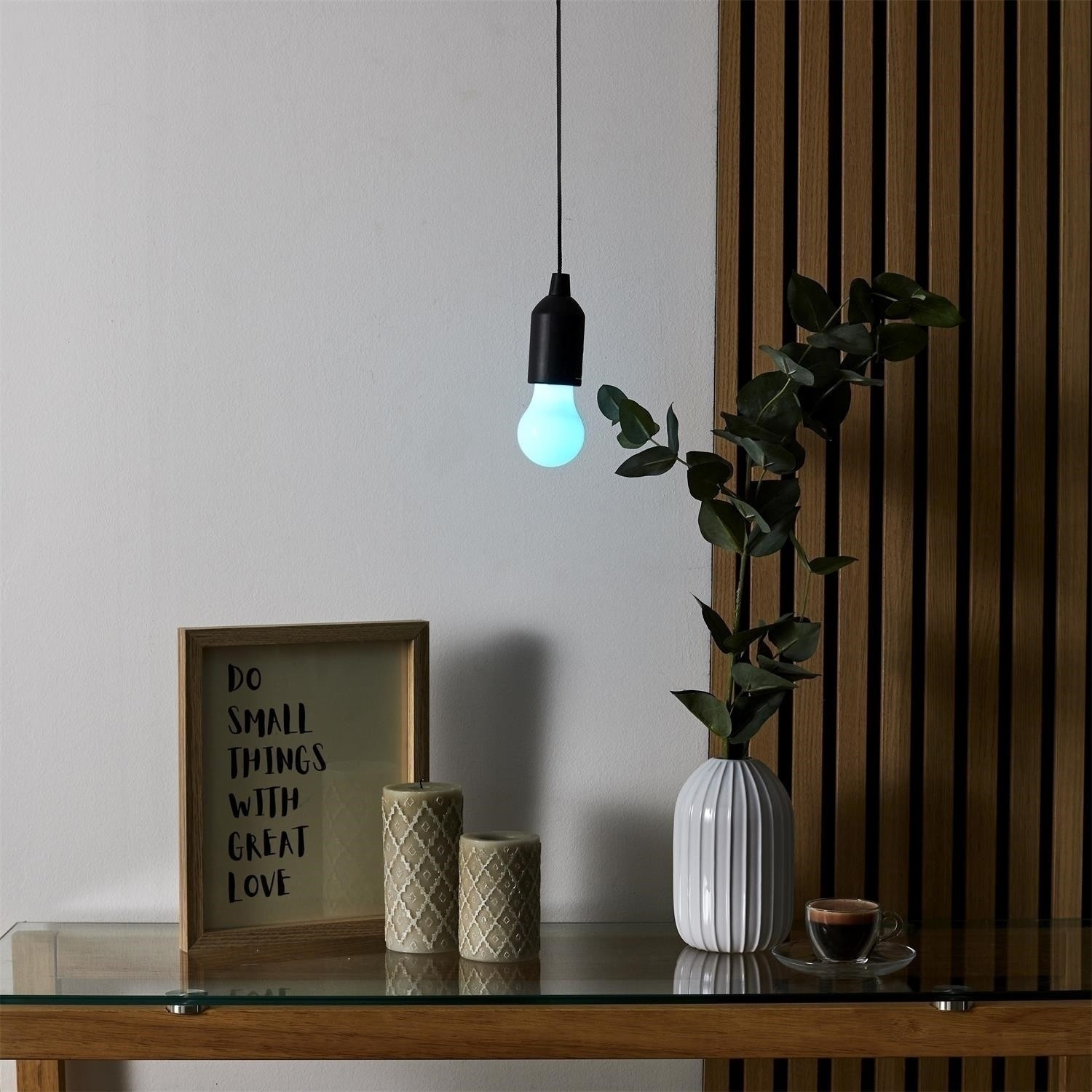 Ledová žárovka na baterie se hodí, když chceme osvětlit koutek, ve kterém nemáme síťové napájení. Lampička s mléčným stínidlem připomínajícím svým tvarem žárovku o průměru 5 cm je snadná na montáž. Stačí ji připevnit pomocí provázku k jakémukoliv prvku. Vypínač lampičky byl umístěn na jejím plastovém prvku. Stačí kliknout, aby ji zapnout. Napájená na baterie (není součástí balení). Délka provázku 110 cm. Lampička vybavená dálkovým ovladačem, který umožňuje změnu barvy světla.