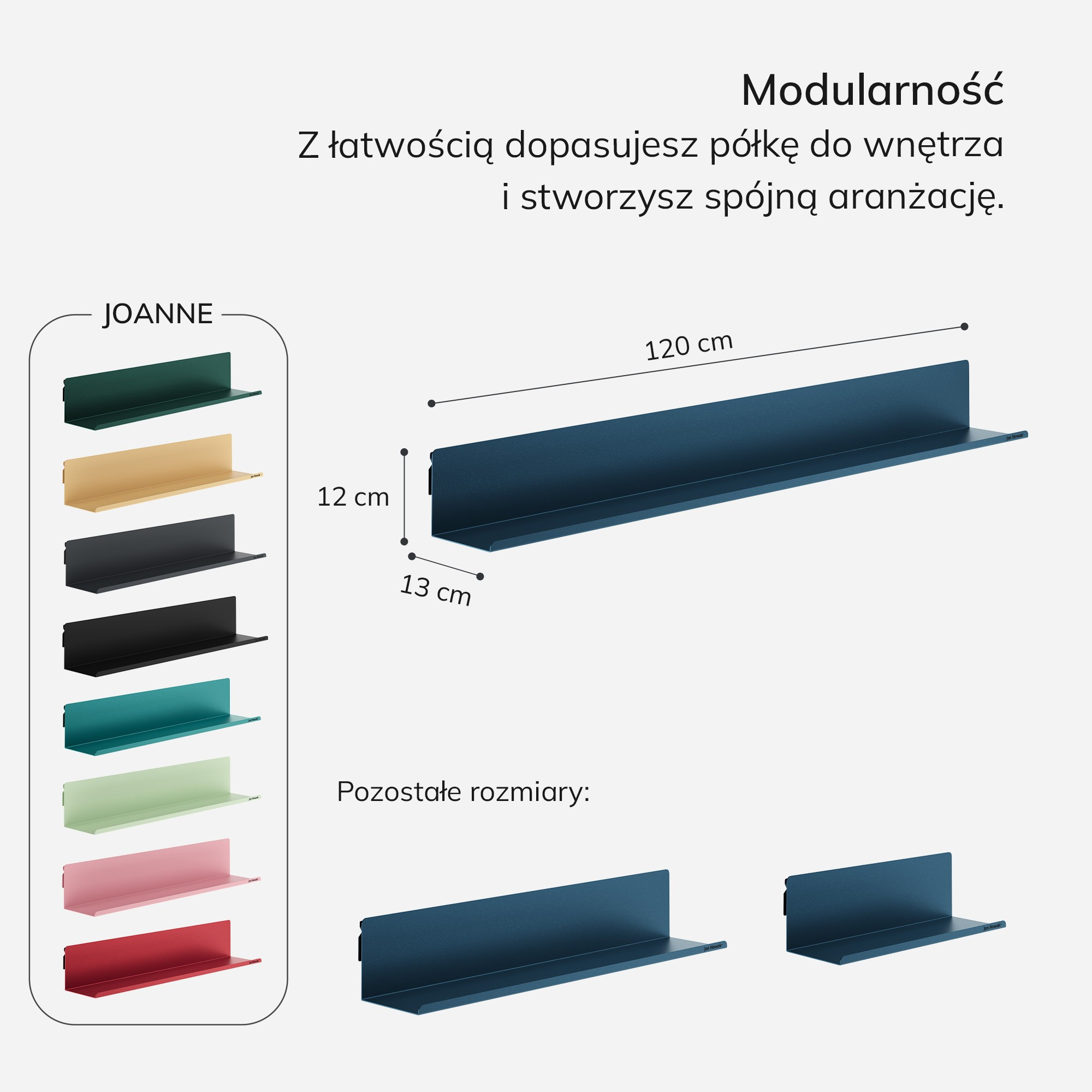 Závěsná police JOANNE je ideální volbou pro ty, kteří hledají kombinaci praktického úložného řešení a stylového designového prvku. Její odolná konstrukce, unikátní barva a snadná montáž z ní dělají skvělý doplněk do každého interiéru. Nechte se okouzlit její krásou a funkčností a vytvořte si vlastní osobitý prostor.