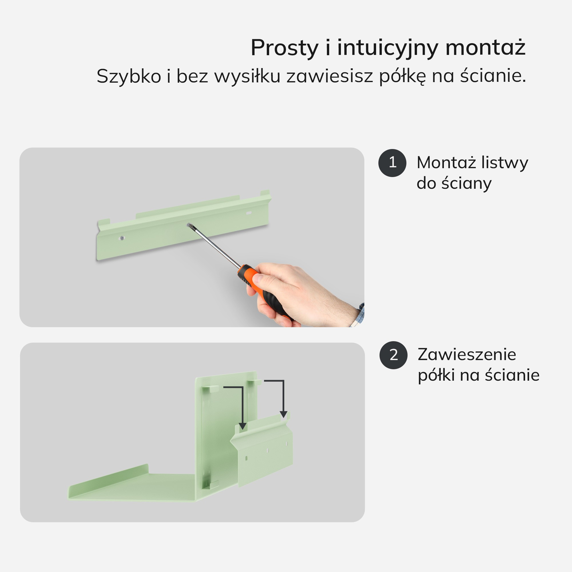Díky skrytému systému upevnění působí police JOANNE elegantně a neruší ji žádné viditelné podpěry. Montáž je jednoduchá a rychlá – stačí připevnit lištu ke zdi a zavěsit polici.
