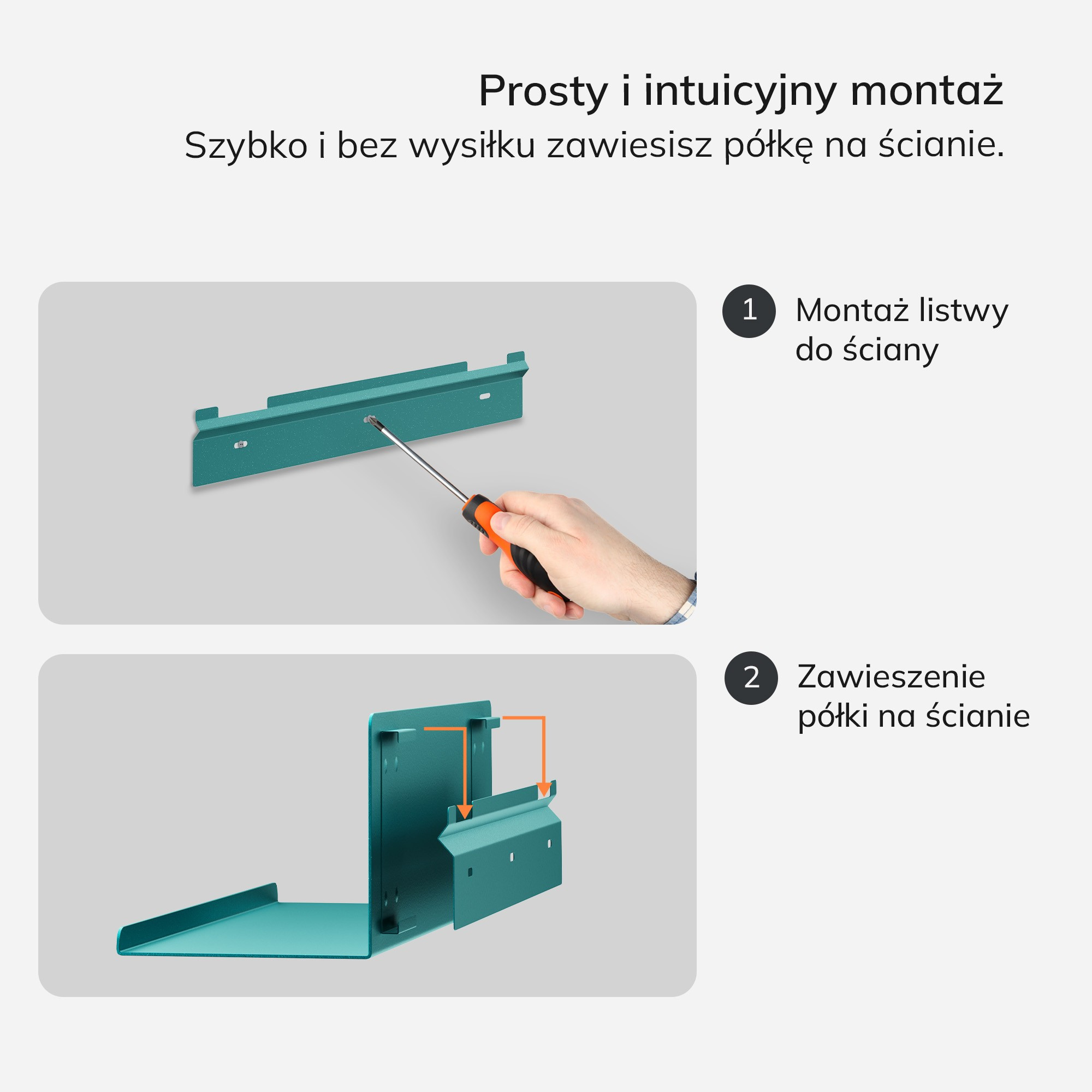 Montáž police JOANNE je rychlá a snadná. Stačí připevnit lištu ke zdi a zavěsit polici. Díky jednoduchému systému upevnění to zvládne každý, bez nutnosti odborné pomoci. Ušetřete čas a energii a užijte si novou polici během několika minut.