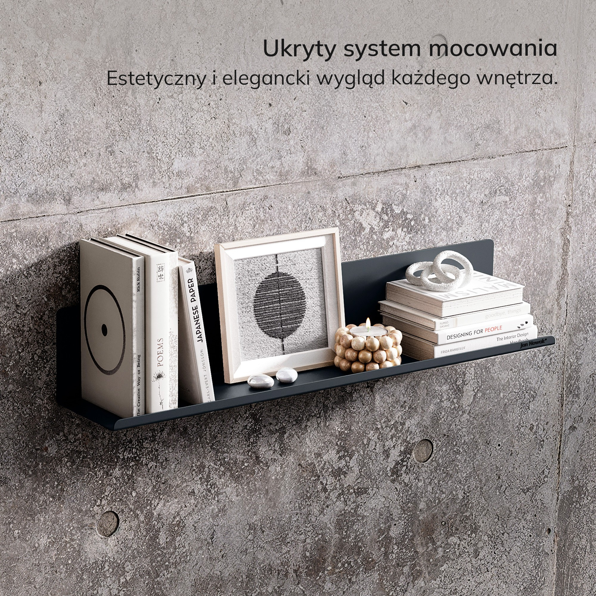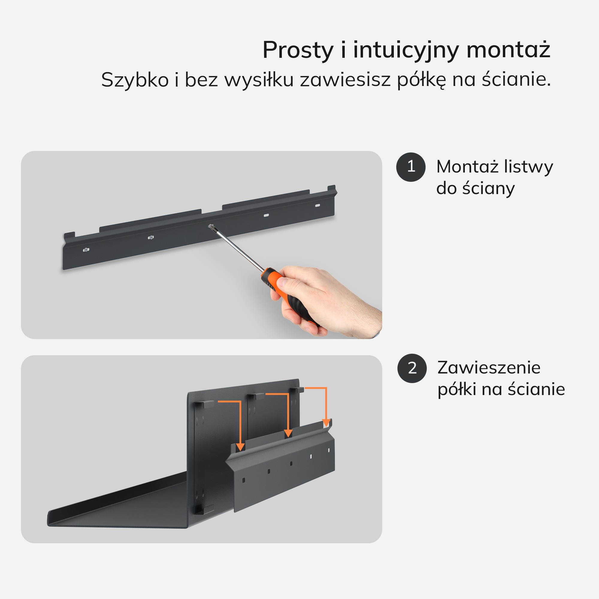 Montáž police JOANNE je rychlá a jednoduchá. Díky skrytému systému upevnění vypadá police elegantně a konzoly nejsou viditelné. Stačí připevnit lištu ke zdi a zavěsit polici. Modulární konstrukce umožňuje sestavovat několik polic vedle sebe nebo vertikálně, což se skvěle hodí i do malých prostor. Vytvořte si vlastní úložný systém, který bude přesně odpovídat Vašim potřebám.