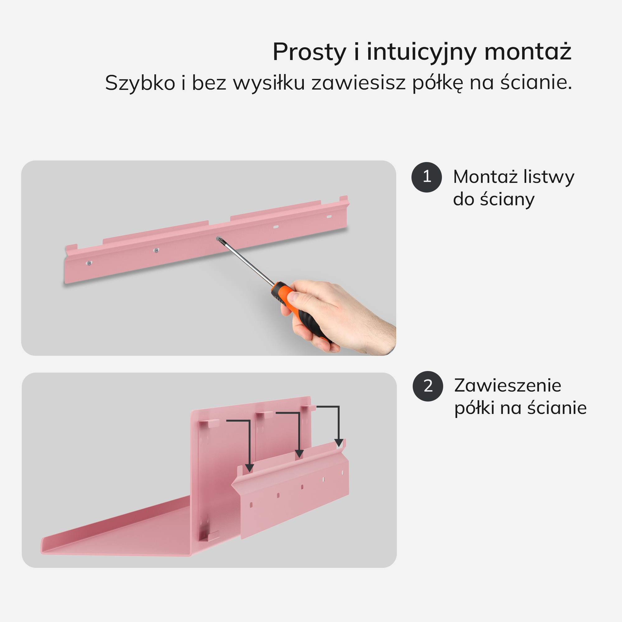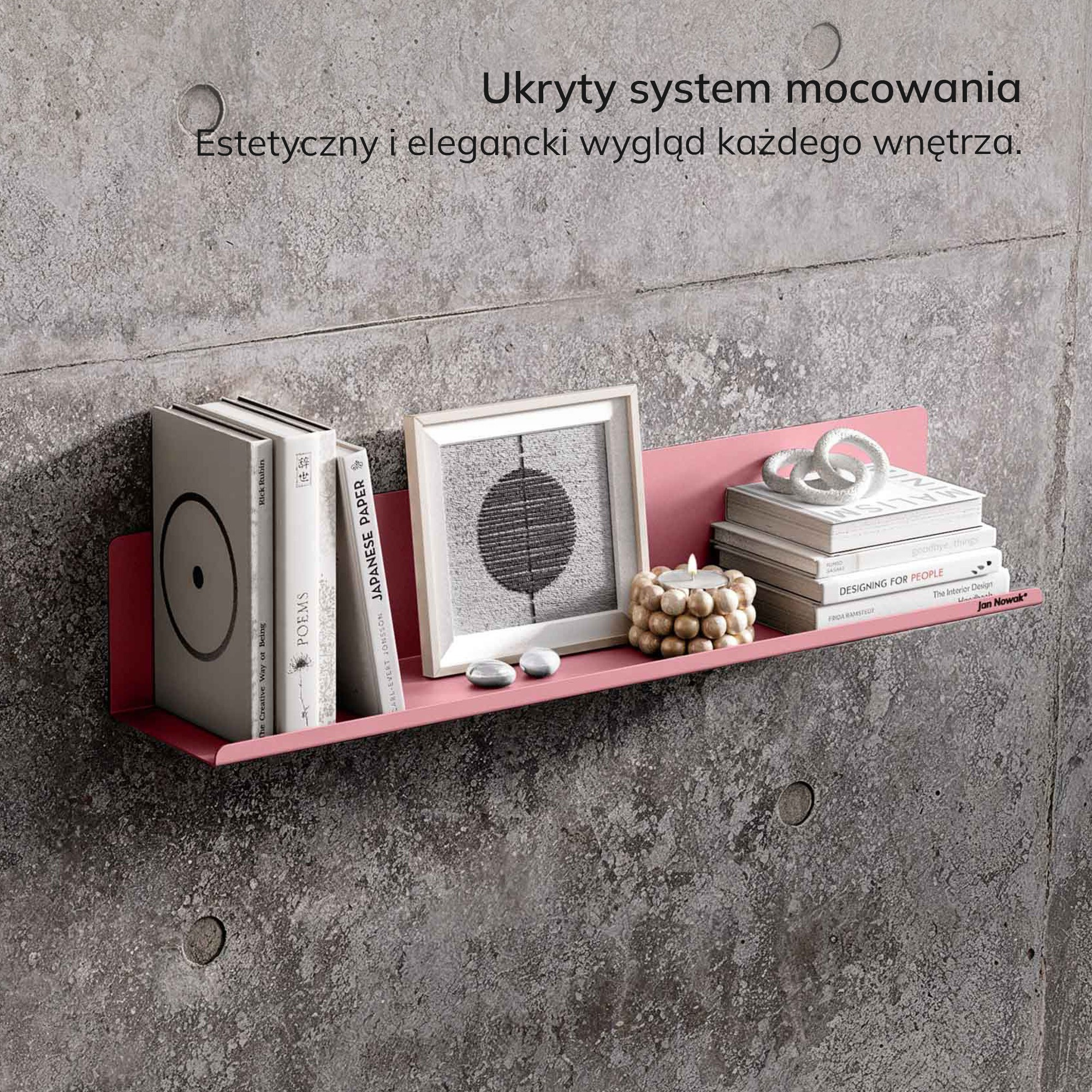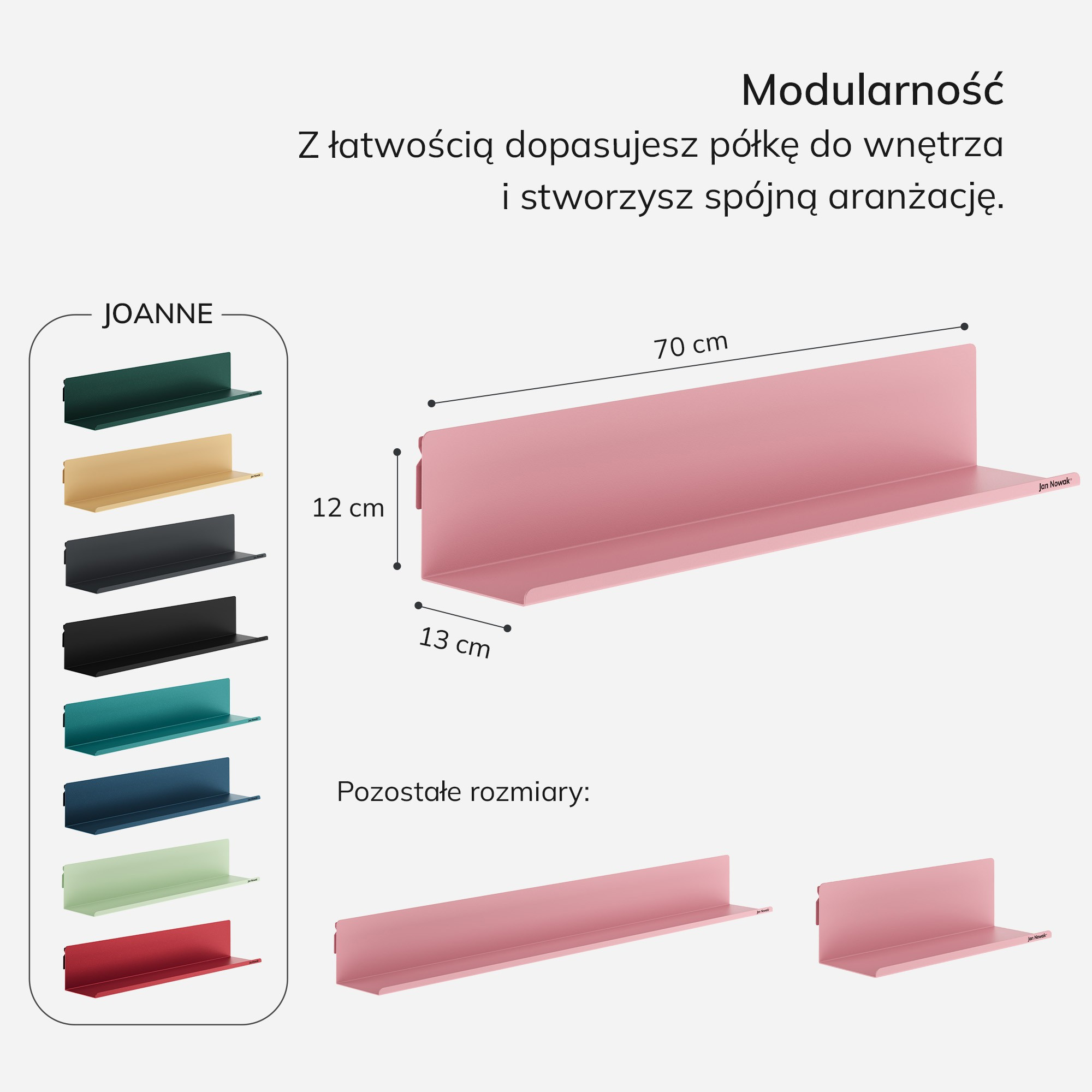 Montáž police JOANNE je rychlá a jednoduchá. Díky skrytému systému upevnění vypadá police moderně a elegantně, bez viditelných podpěr. Můžete ji snadno připevnit na zeď a ihned začít využívat. Modulární konstrukce police vám umožňuje sestavovat police v různých konfiguracích – vodorovně nebo svisle – což vám dává velkou svobodu při aranžování vašeho prostoru. Můžete si vytvořit vlastní jedinečný systém polic, který bude přesně odpovídat vašim potřebám a vkusu.