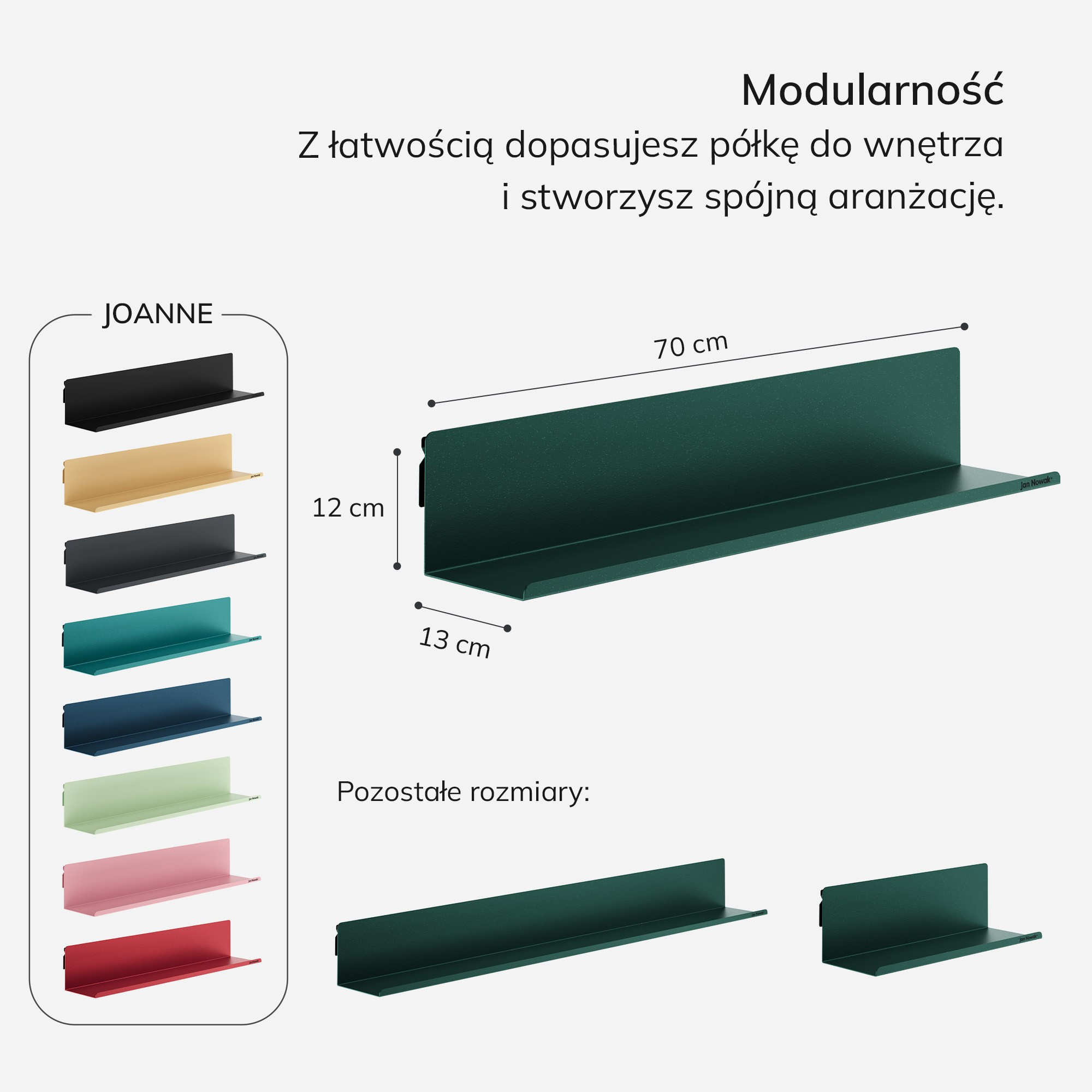 Představujeme vám závěsnou polici JOANNE, která v sobě snoubí nadčasovou eleganci a praktickou funkčnost. Tato police v okouzlujícím odstínu lahvově zelené je dokonalým doplňkem do každého moderního interiéru. Její jedinečný design a kvalitní provedení z ní činí nejen úložný prostor, ale i výrazný dekorativní prvek.