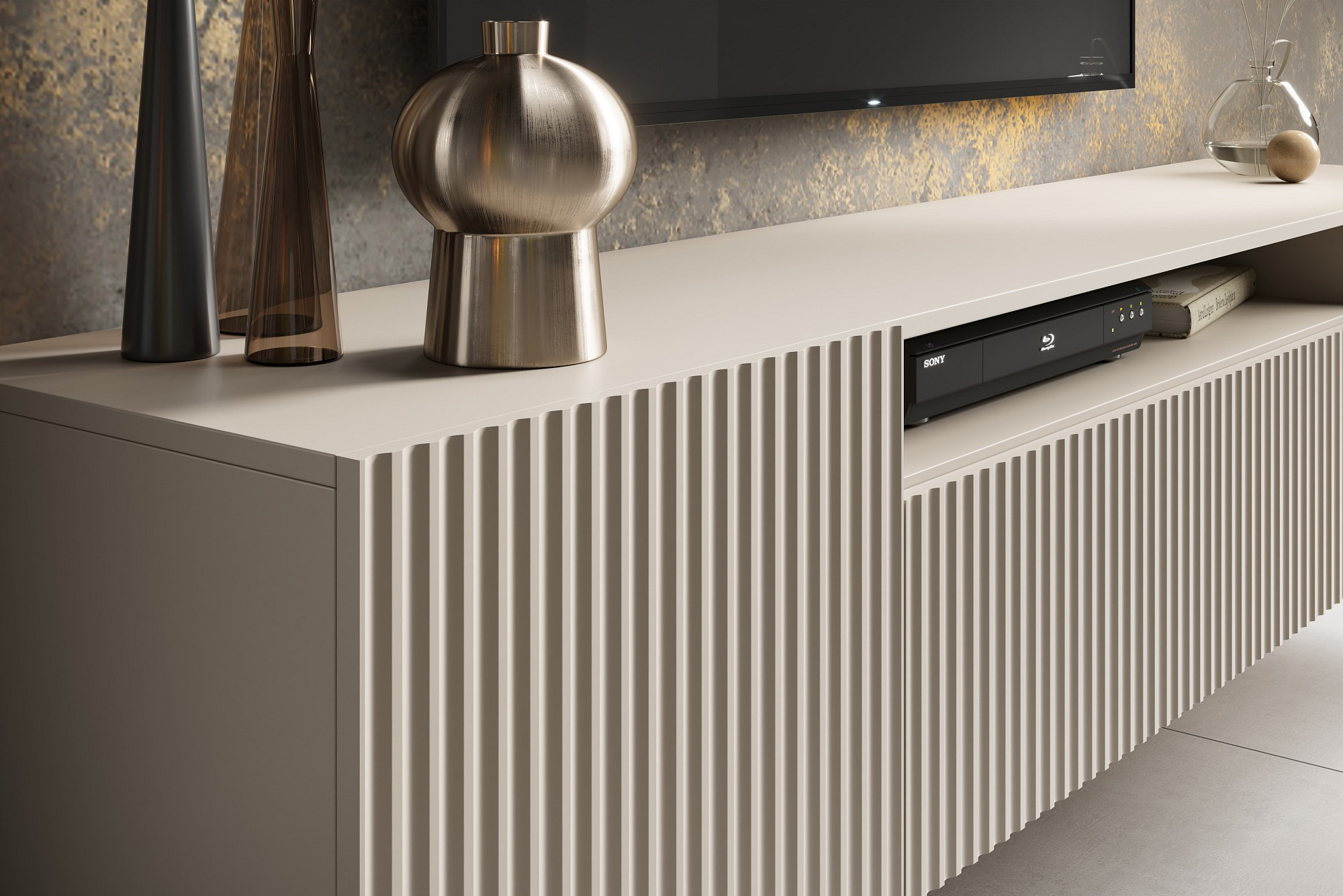 RTV Noemi je moderní, elegantní a funkční televizní skříňka, ideální pro použití v moderních interiérech. Jeho unikátní vlastností je drážkované provedení, které dodává nábytku charakter a texturu. Skříňka byla navržena tak, aby obsahovala vhodné přihrádky a police pro uložení různorodého elektronického vybavení, včetně televize, set-top boxu, herní konzole a mnoha dalších.