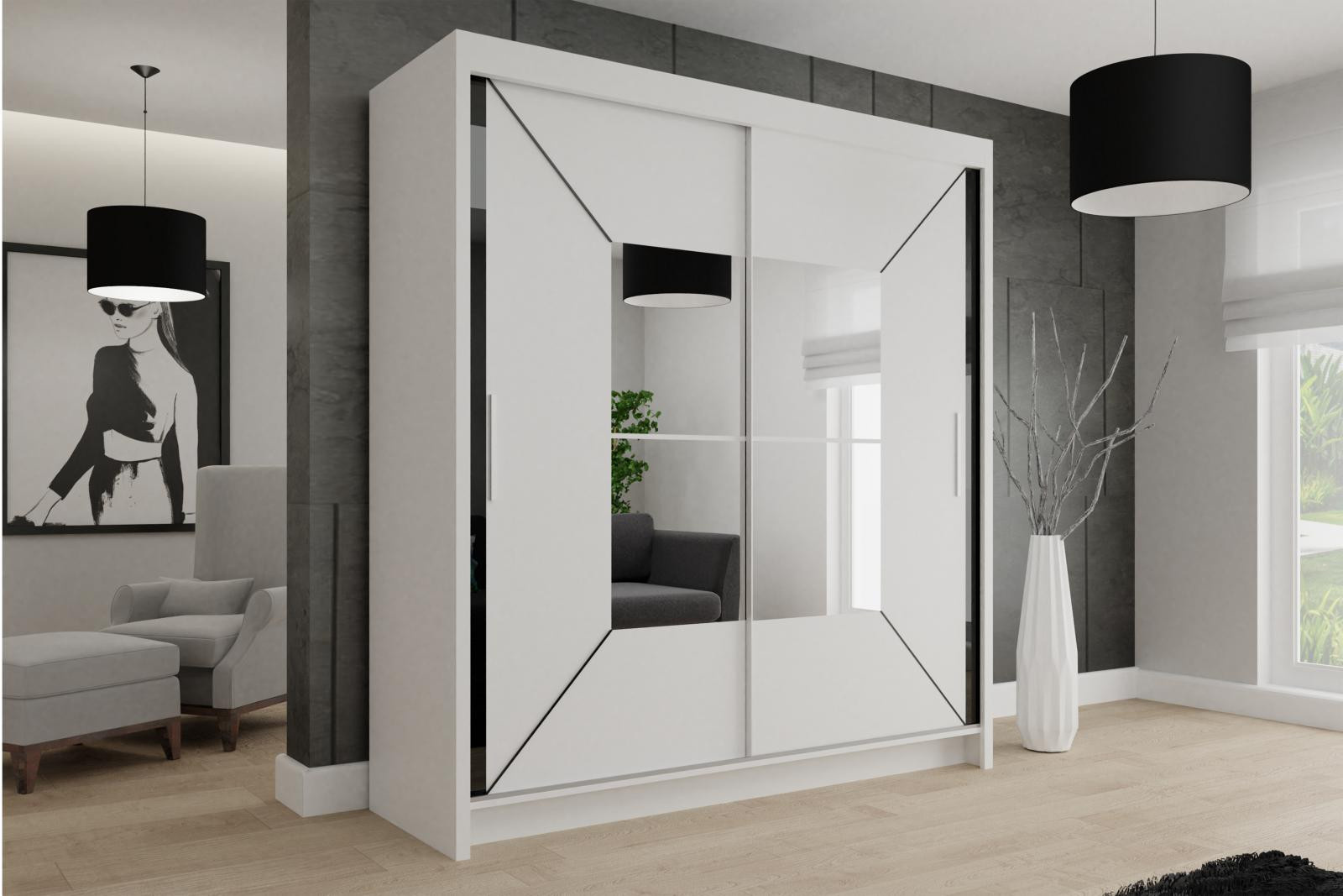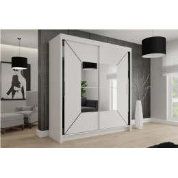 Skříň s posuvnými dveřmi Mario je vyrobena z kvalitního lamina. Dveře skříně jsou osazeny zrcadlem a na bocích jsou ozdobné pásky v černém lesku. Tyto doplňky dodávají skříni originální a elegantní vzhled. Díky svému vnitřnímu uspořádání nabízí dostatek úložného prostoru, posuvné dveře šetří prostor a zrcadlo ho opticky zvětší a prosvětlí. Skříň najde uplatnění v ložnici, dětském nebo studentském pokoji, v předsíni i kanceláři. Nabízíme ji v rozměrech 120 cm, 150 cm,180 cm a 200 cm. Všechny nabízené rozměry jsou dostupné v bílé barvě a dále také v dekoru sonoma. Skříň je dodávána v demontu a součástí je montážní plánek včetně všech potřebných spojovacích prvků. Vyobrazené dekorace nejsou v ceně.