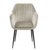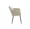 Židle Emilia Velvet je mimořádně efektní kus nábytku, který odkazuje na skandinávský styl. Čalouněné sedadlo vyrobené z látky VIC sand A80 má efektní prošívání, které je zdůrazněno sametem v béžové barvě. Základna byla vyrobena z kovu natřeného na černou barvu. Rafinovaná židle do jídelny, obývacího pokoje nebo restaurace. Svislé švy mu dodávají elegantní vzhled. Výška opěradla 44 cm Šířka sedáku 36 cm Hloubka sedáku 39 cm Maximální výška sedáku. 49 cm Výška područky od podlahy 66 cm Šířka područky 5 cm Hloubka područky 37 cm Výška područky 23 cm Rozměry balení: 58x61x50 cm