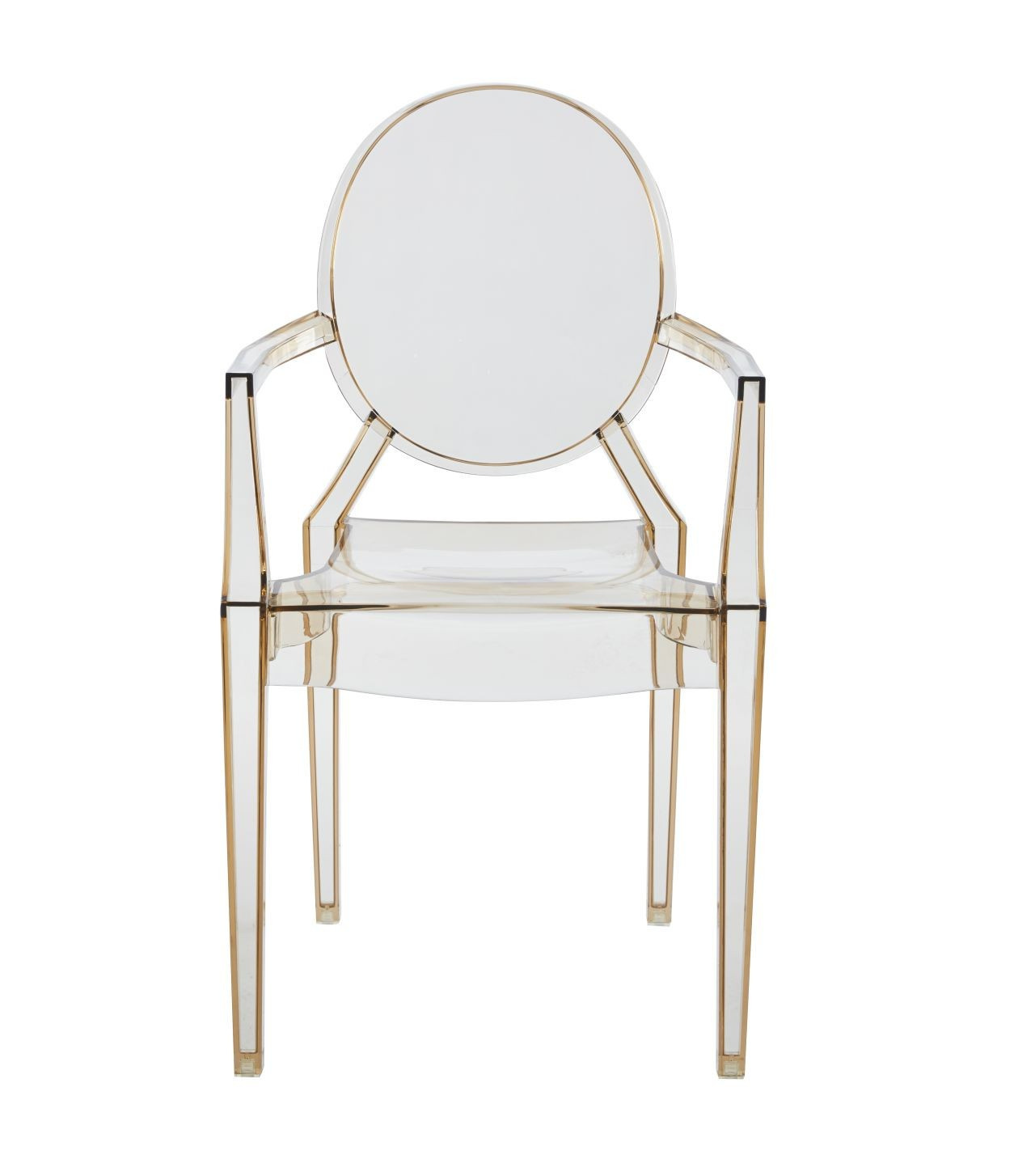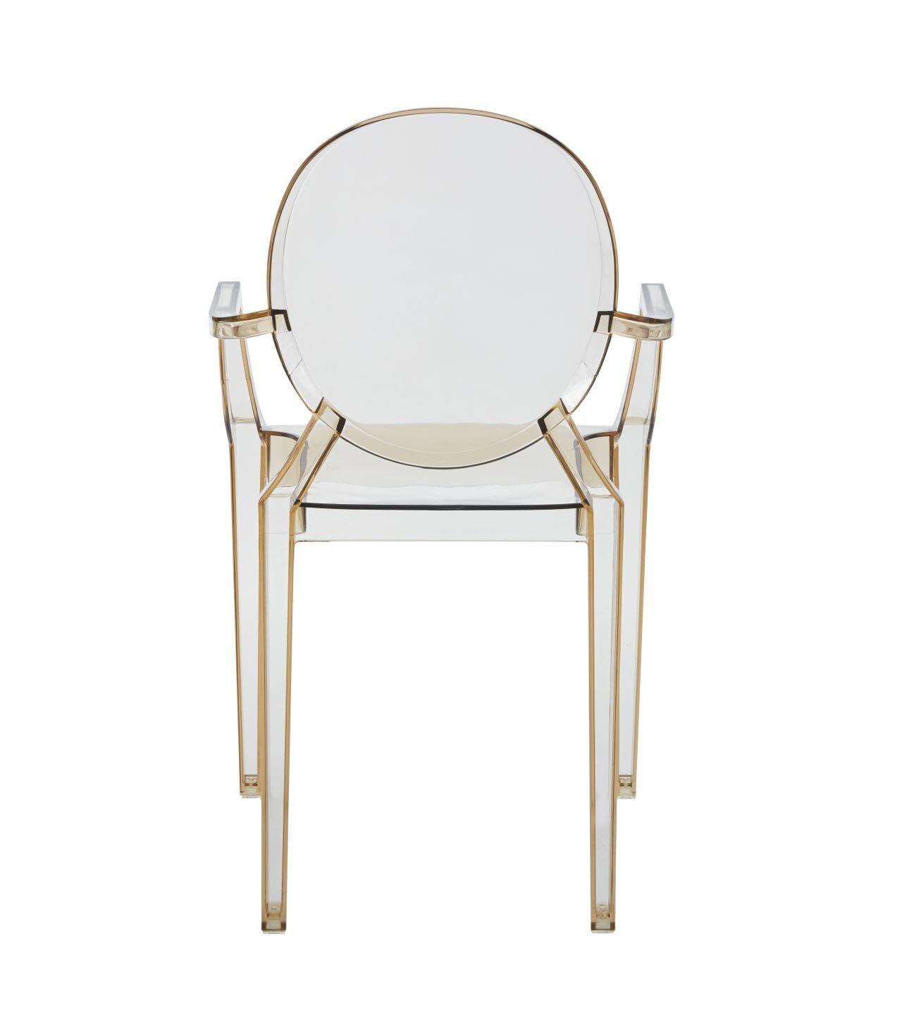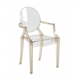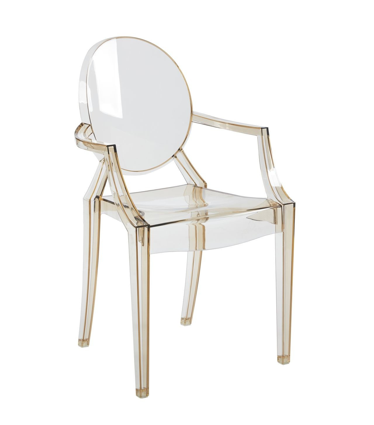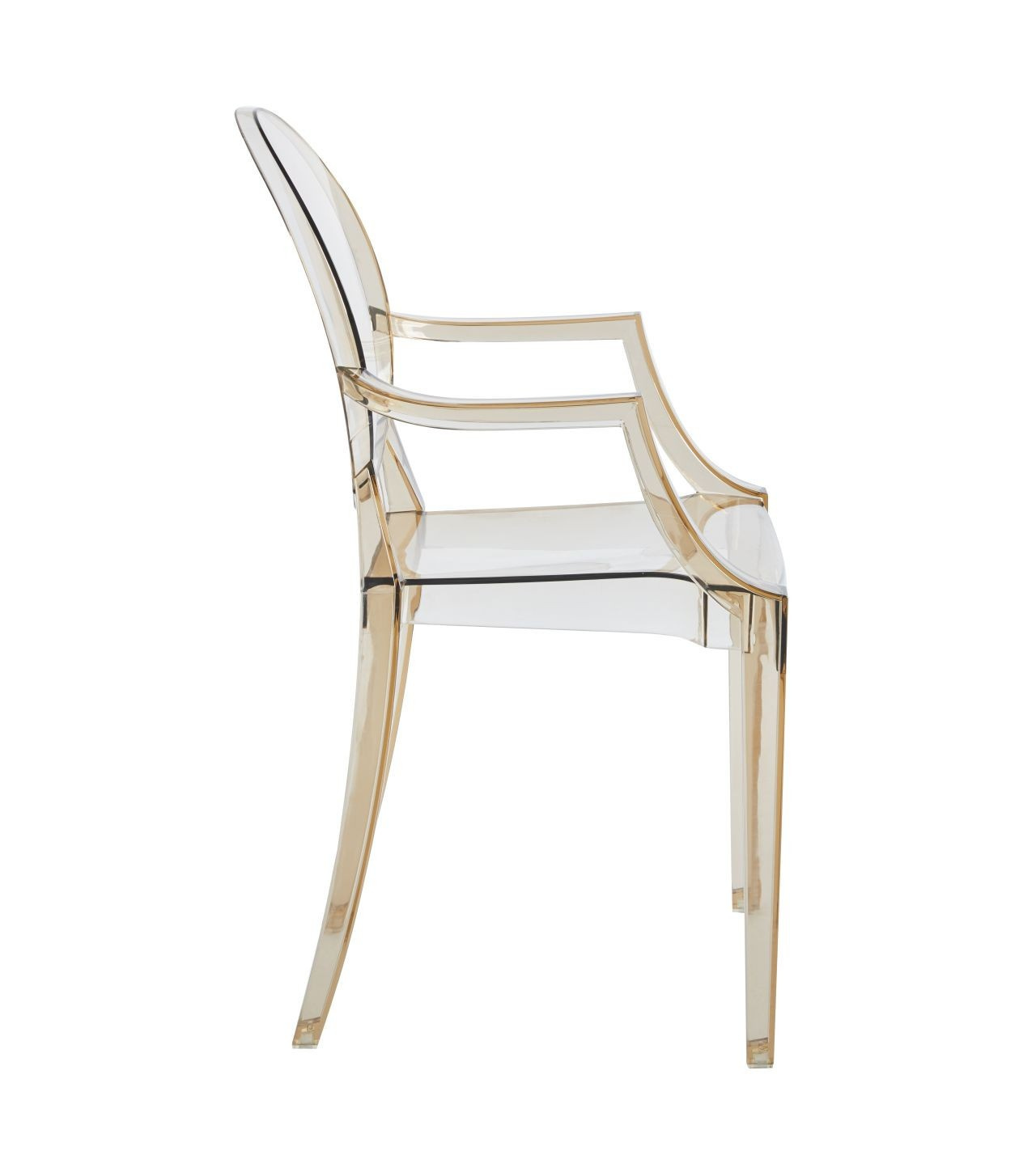 Rozměry: - šířka sedáku: 54 cm (přední část sedáku), 32 cm (zadní část sedáku) - výška sedáku: 48 cm - celková výška: 92 cm - hloubka sedáku: 42 cm Materiál: - polykarbonát Barva: - jantarová