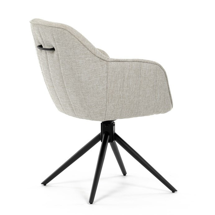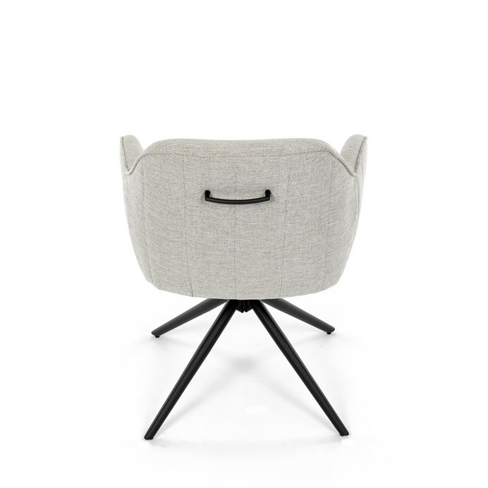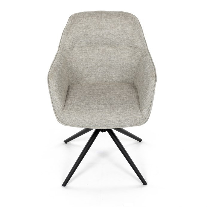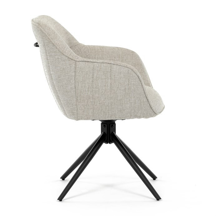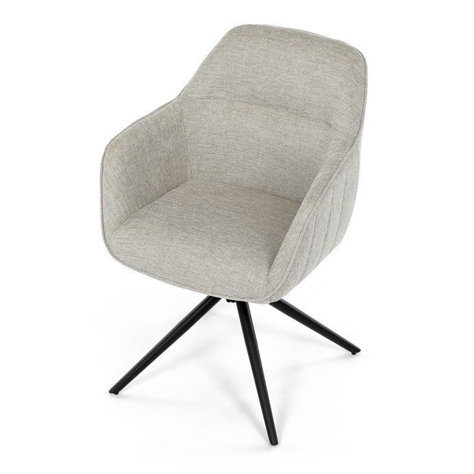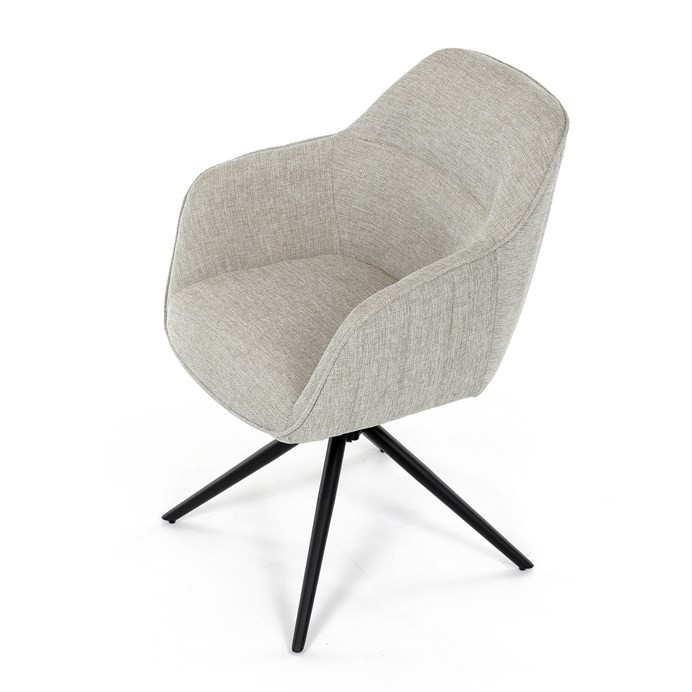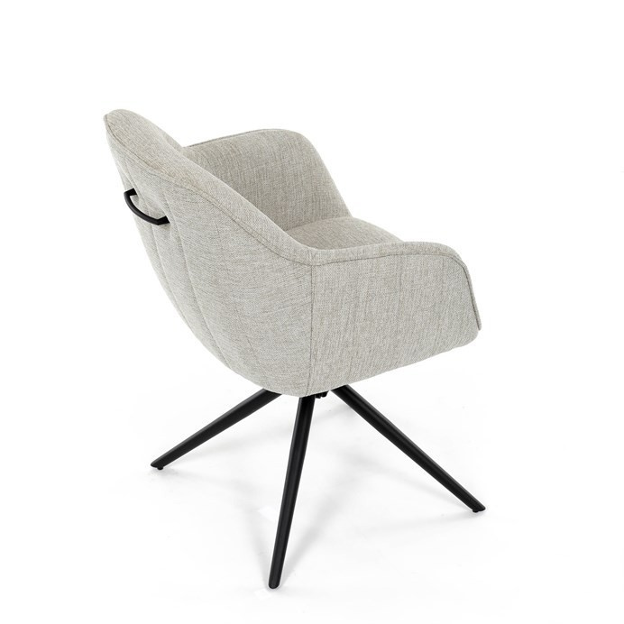 Moderní jídelní židle v krémové barvě s efektním prošitím zádové i přední části opěráku. Prošití je v brvě potahového materiálu. Zadní část opěráku je opatřena vkusným madlem pro snazší manipulaci. Čtyři kovové nohy v matném práškovém nástřiku vycházejí z centrálního bodu ve středu sedáku. Sedák je otočný o P90°+ L 90° s vratným mechanismem - funkce reset.