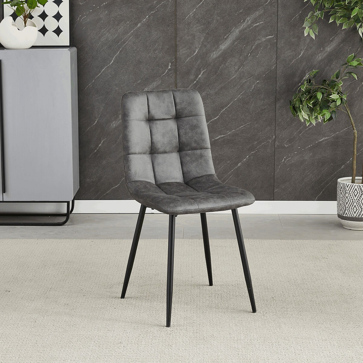 Jídelní židle značky Autronic v moderním industriálním stylu je skvělou volbou pro každou jídelnu. Potah z látky vintage v šedém odstínu dodává nábytku osobitý charakter, zatímco elegantní čtvercové prošívání podtrhuje její vzhled. Černé kovové nohy poskytují stabilitu a ladí s minimalistickým designem. Komfort při sezení zajišťuje měkké polstrování z PU pěny, díky kterému je židle ideální jak pro každodenní používání, tak pro slavnostní chvíle.