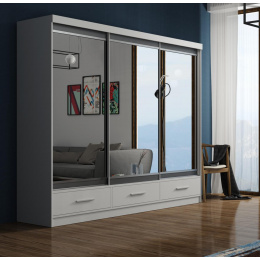 Šatní skříň Margita je vyrobena z lamina. Má posuvné dveře, které šetří prostor a na dveřích skříně jsou zrcadla, které místnost opticky zvětší a prosvětlí. Díky svému vnitřnímu uspořádání (vyobrazeno v doplňkových fotografiích) nabízí skříň dostatek úložného prostoru. Skříň je také vybavena zásuvkami, do kterých můžete uložit drobnosti. Skříň Margo najde uplatnění např. v dětském nebo studentském pokoji, v předsíni, v ložnici i v obývacím pokoji. Nabízíme ji v rozměrech 120 cm, 150 cm, 200 cm a 250 cm. Všechny nabízené rozměry jsou dostupné v černé a bílé barvě a dále také v dekoru sonoma. Skříň je dodávána v demontu a součástí je montážní plánek včetně všech potřebných spojovacích prvků. Vyobrazené doplňky a dekorace nejsou v ceně. ÚVODNÍ FOTOGRAFIE JE ILUSTRAČNÍ. SKŘÍŇ BUDE DODÁNA V ČERNÉ BARVĚ.