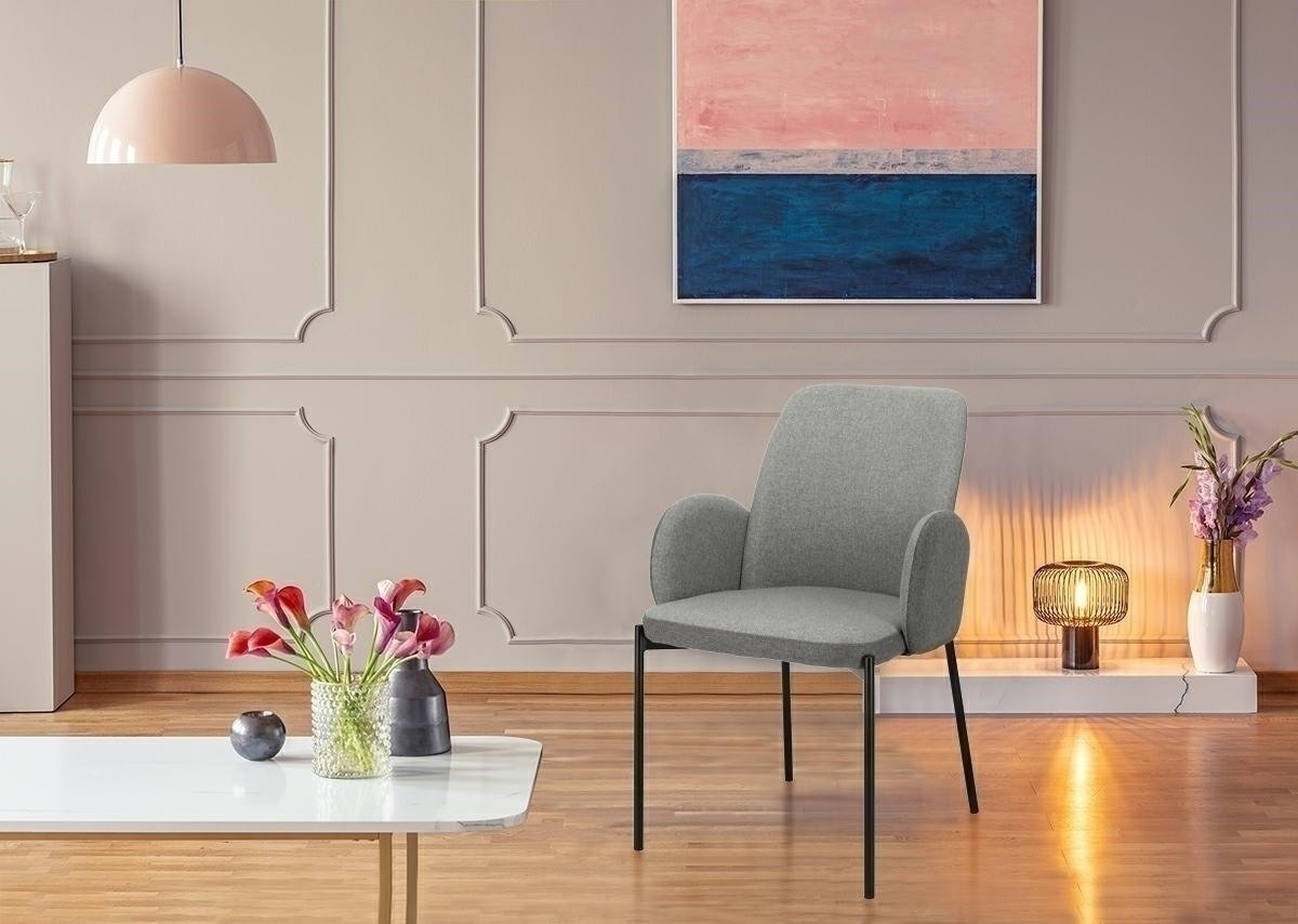 Židle Perro je okouzlující prvek vybavení, který se dokonale hodí do každé stylové jídelny nebo obývacího pokoje. Židle Perro je ideální sedadlo do interiérů jak v moderních, tak i tradičních aranžmá. Díky svému tvaru a čalounění příjemnou na dotek látkou se židle vyznačuje ergonomií a pohodlím, a díky pevné kovové základně je také odolná a stabilní. Židle je vyplněna měkkou pěnou. Další výhodou jsou propojené designové područky, které se táhnou až po vnitřní straně opěradla, díky čemuž nábytek získává elegantní charakter. Židle byla potažena látkou ve dvou odstínech šedé, které se dokonale hodí k černým nohám židle. Šířka sedáku: 47 cm Hloubka sedáku: 45 cm Rozměry kartonu: 60x60x70 cm Max. množství ks. v kartonu: 2