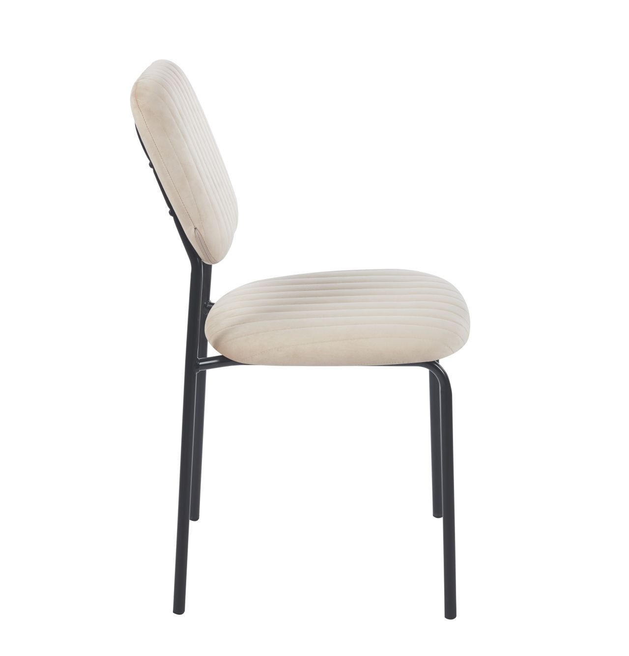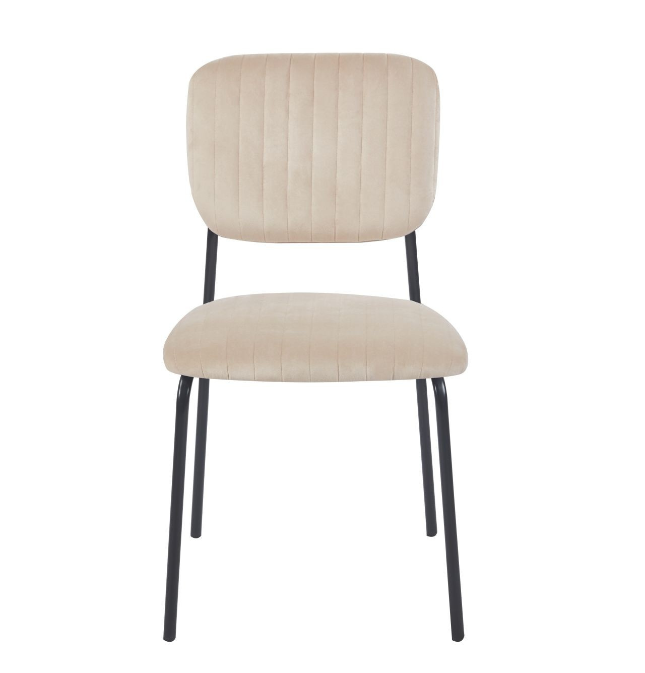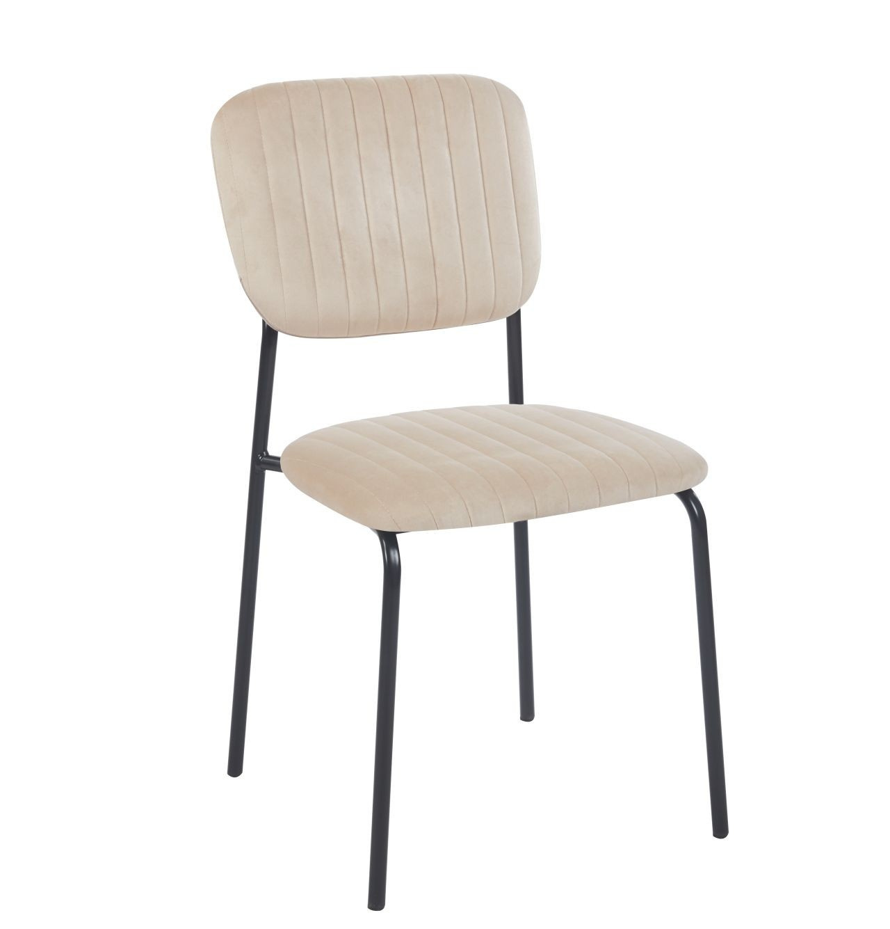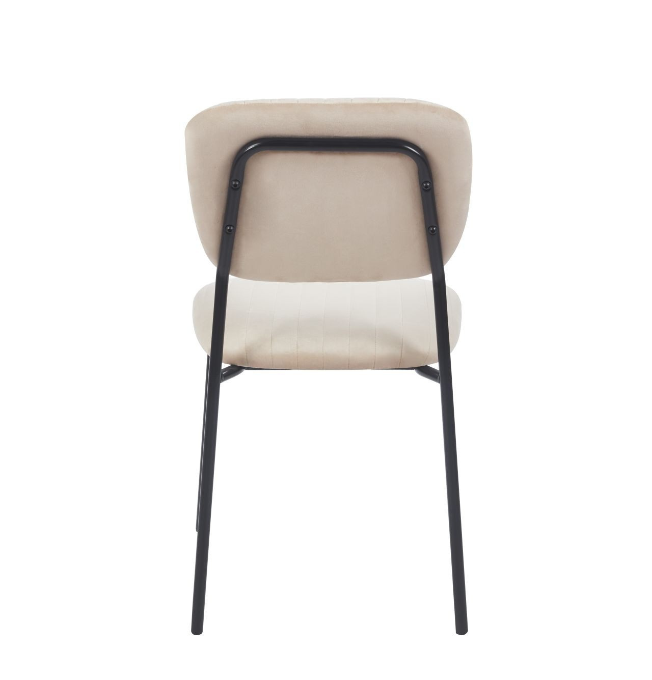 Rozměry: - šířka sedáku: 45 cm - výška sedáku: 48 cm - celková výška: 85 cm - hloubka sedáku: 54 cm Materiál: - čalounění: samet - nohy: kov lakovaný práškovou barvou Barva: - sedák + opěradlo: béžová - nohy: černá Ostatní: - židle stohovatelné