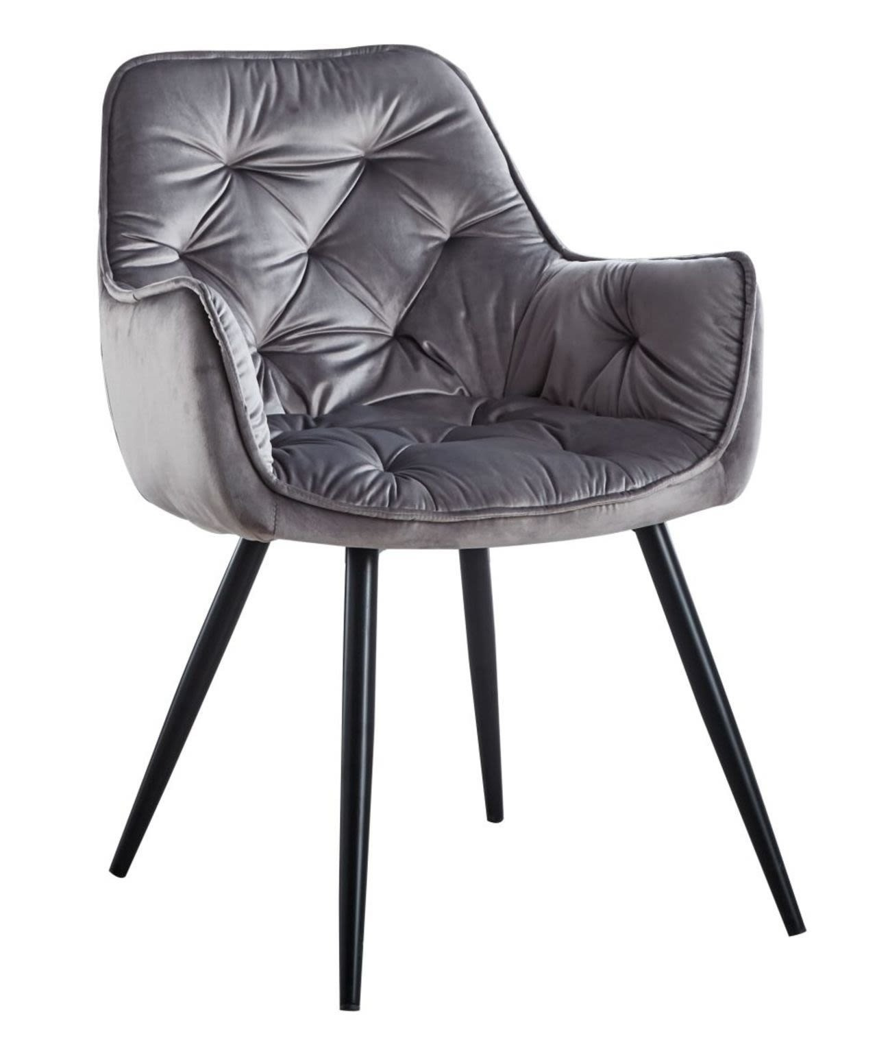Rozměry: - celková výška: 85 cm - výška sedáku: 50 cm - výška područek od podlahy: 66 cm - výška područek od sedáku: 20 cm - výška opěradla: 43 cm - celková šířka: 61 cm - šířka sedáku: 40 cm - hloubka sedáku: 44 cm Materiál - čalounění: samet - nohy: kov lakovaný práškovou barvou Barva: - sedák: šedý - nohy: černé