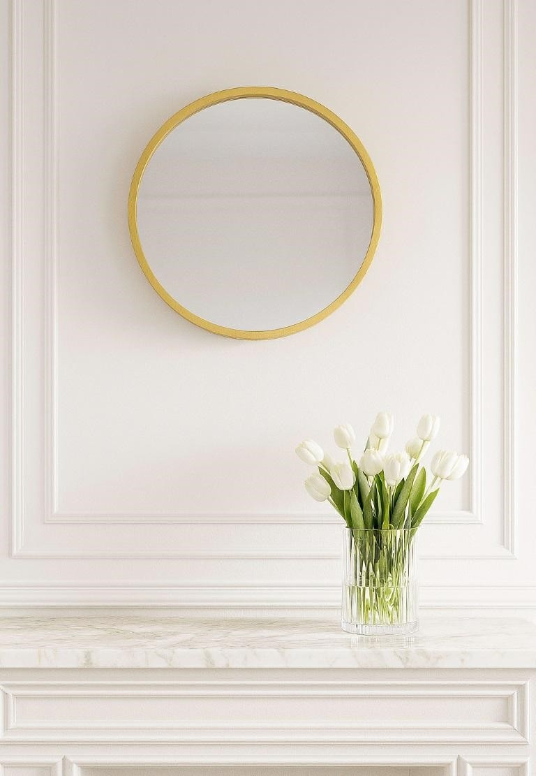 Kulaté zrcadlo o průměru 30 cm ve zlatém rámu se hodí do předsíně nebo k toaletnímu stolku. Zrcadlo v silném dřevěném rámu natřeném na černo má úchyty pro zavěšení. Silný rám o tloušťce až 2,5 cm dodává celku kontrast a zapadne do stylu loftového interiéru. Rozměry balení: 30,5x30,5x3,5 cm