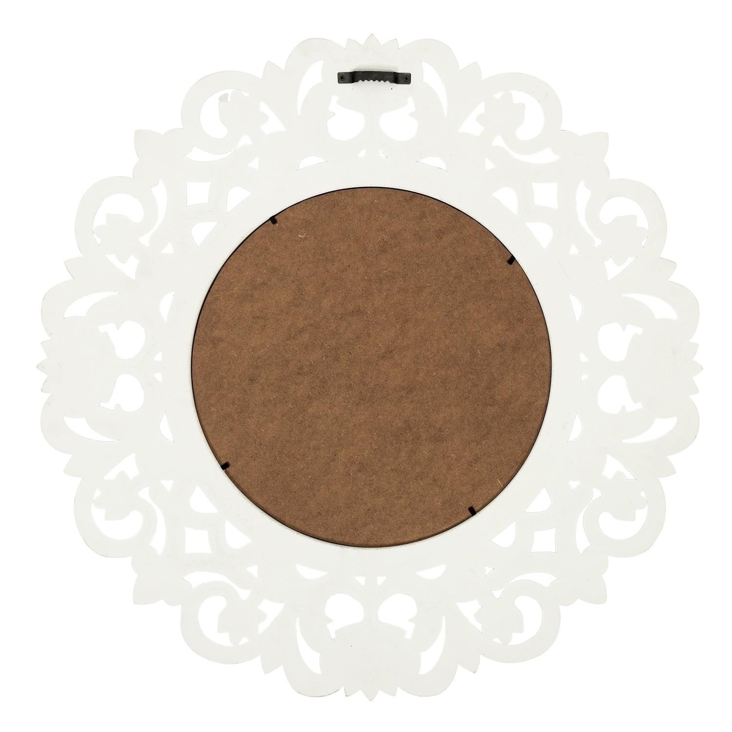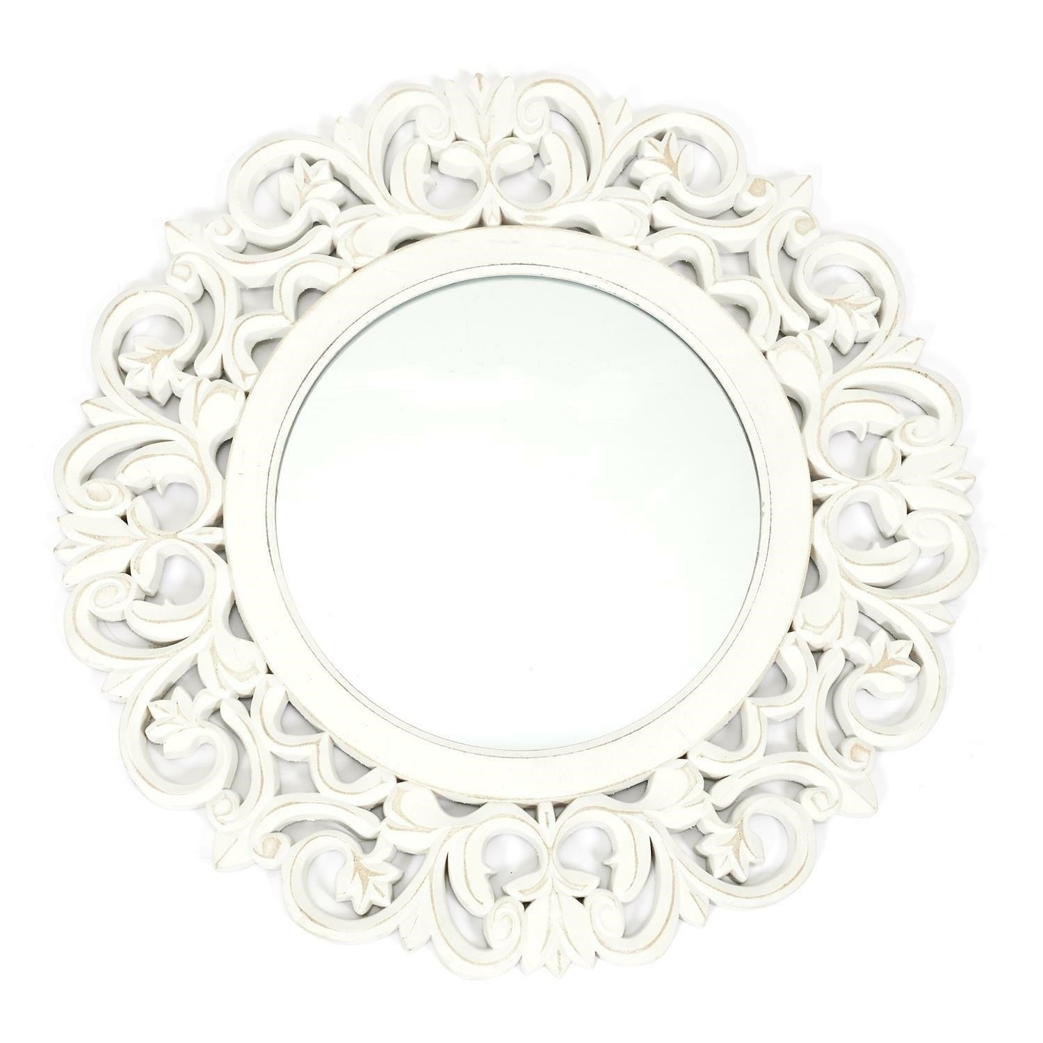 Zrcadlo Sculpted bílé v ozdobném rámu je dekorace do interiéru ve stylu glamour. Bílý, kulatý rám zrcadla s zajímavými řezbami s pravidelným, opakujícím se vzorem je mírně postaršený. Zrcadlo má úchyt. Materiál MDF Rozměry balení: 61x10x60 cm