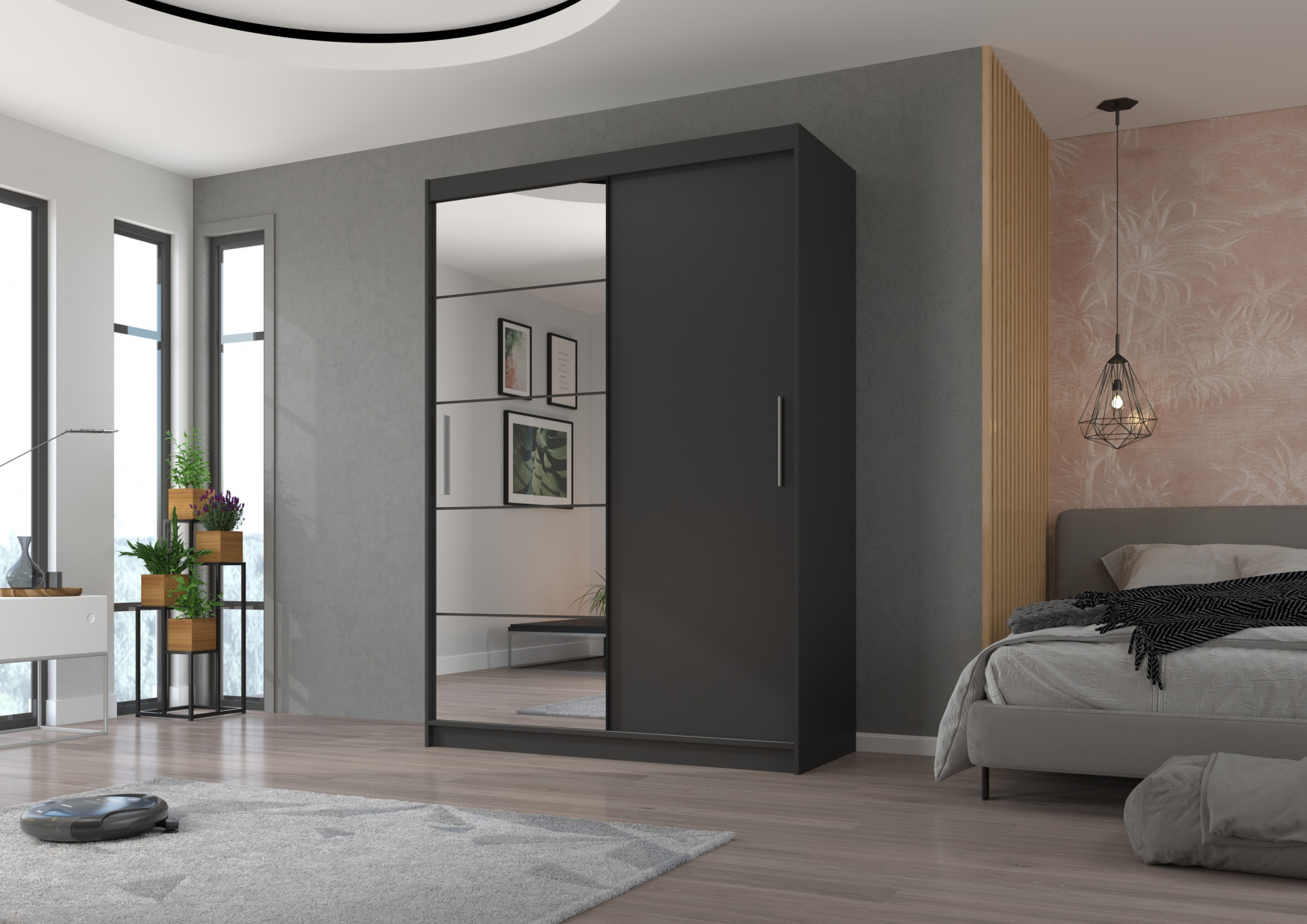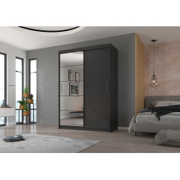 Šatní skříň s posuvnými dveřmi a zrcadlem ESTI je ideálním způsobem, jak uspořádat prostor. Nábytek je vybaven prostornými policemi a tyčí, na kterou můžete pověsit šaty, obleky, svrchní oděvy nebo košile. Na čelní stranu byla připevněna zrcadla, která opticky zvětšují prostor a dodávají mu kouzelný půvab. Díky tomu, že skříň je posuvná, nemusíte vyčleňovat další místo na otevření dveří, což z ní činí ideální řešení pro malý pokoj nebo úzkou předsíň.