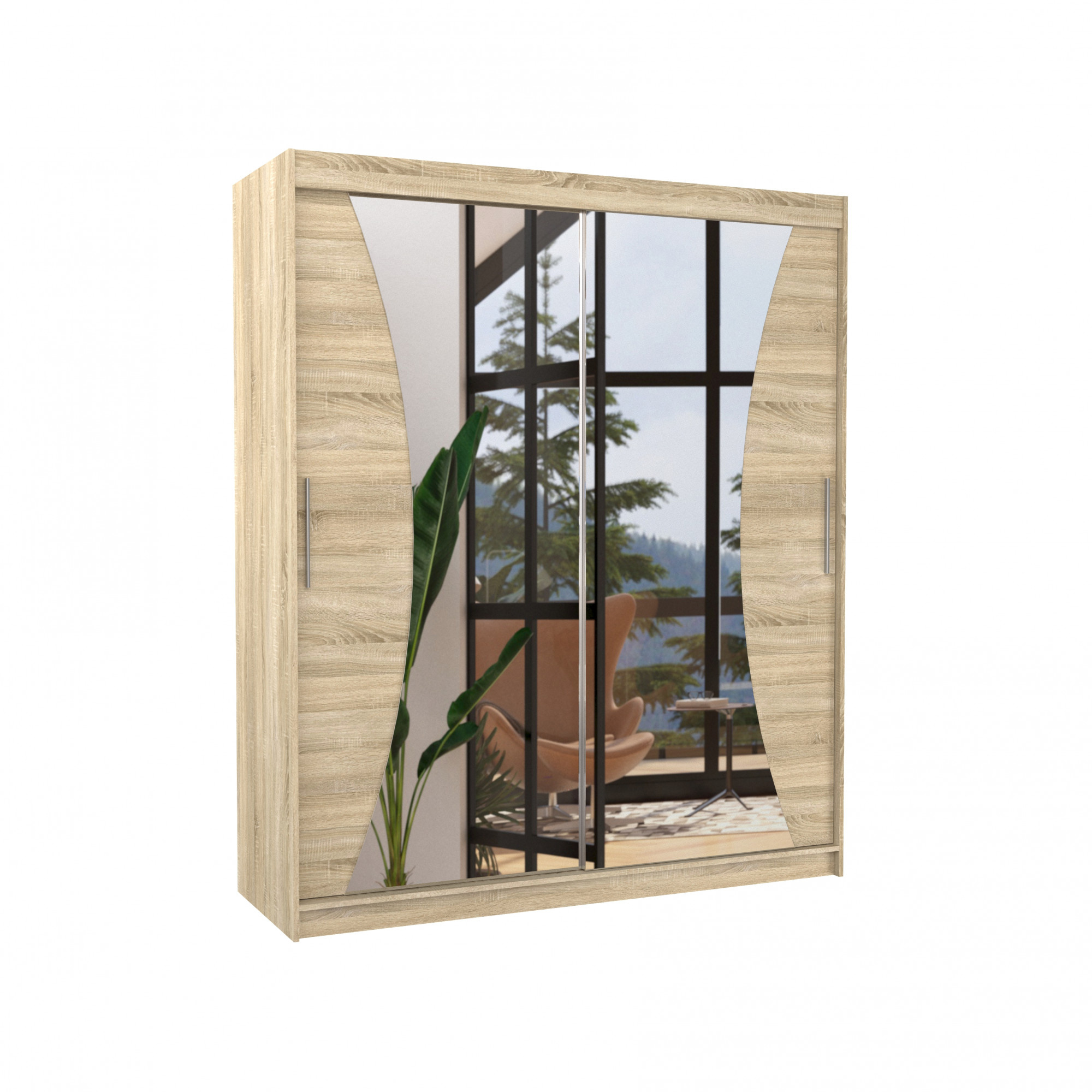 Posuvná skříň CHARLOTTE je ideálním způsobem, jak uspořádat prostor. Nábytek je vybaven prostornými policemi a tyčí, na kterou můžete pověsit šaty, obleky, svrchní oděvy nebo košile. Na čelní straně se nacházejí zrcadla, která dodávají nábytku výjimečný styl. Díky tomu, že skříň je posuvná, nemusíte vyčleňovat další místo na otevření dveří, což z ní činí ideální řešení pro malý pokoj nebo úzkou předsíň.