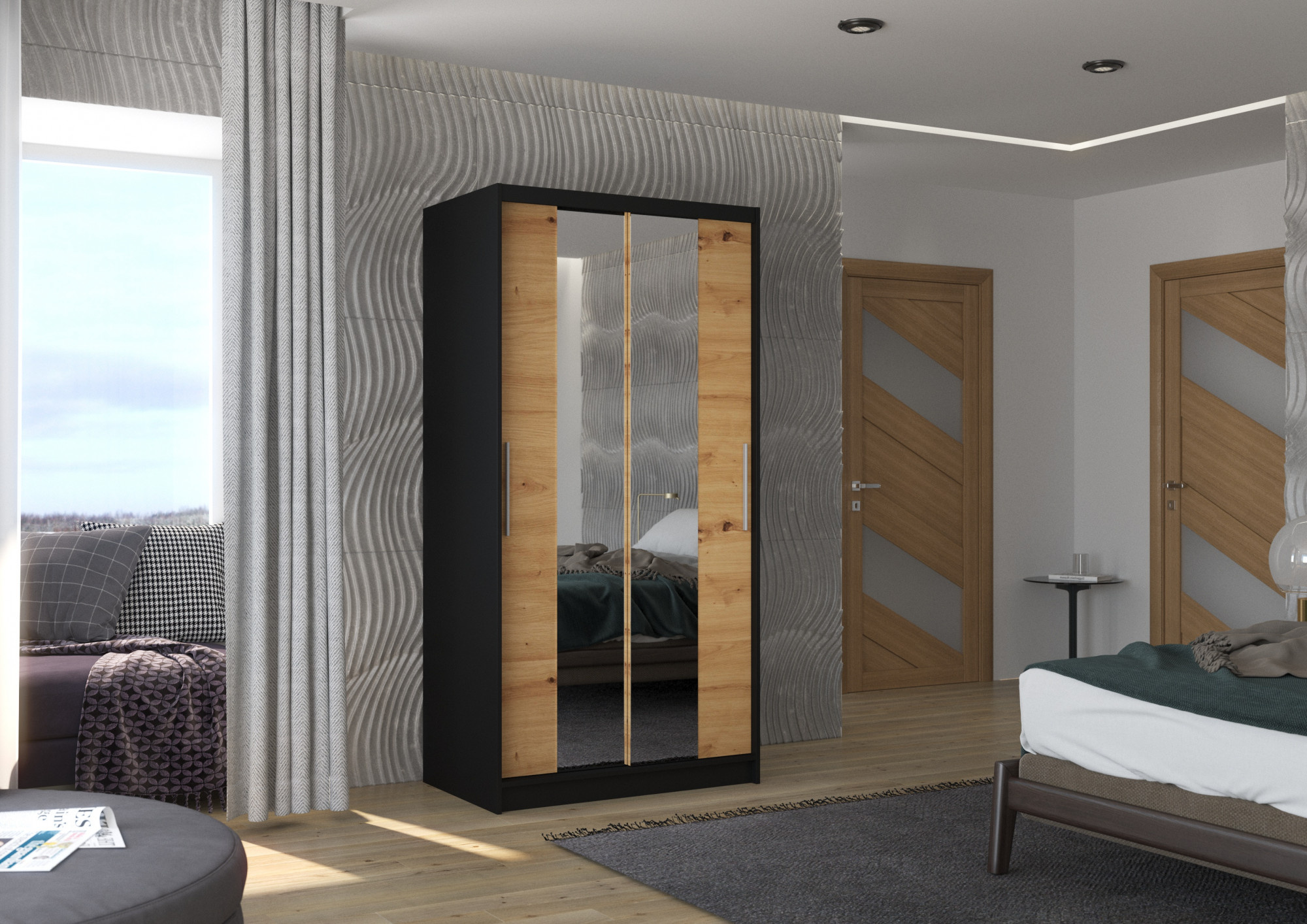 Šatní skříň s posuvnými dveřmi a zrcadlem DRAGONIS 100 Černá+Artisan