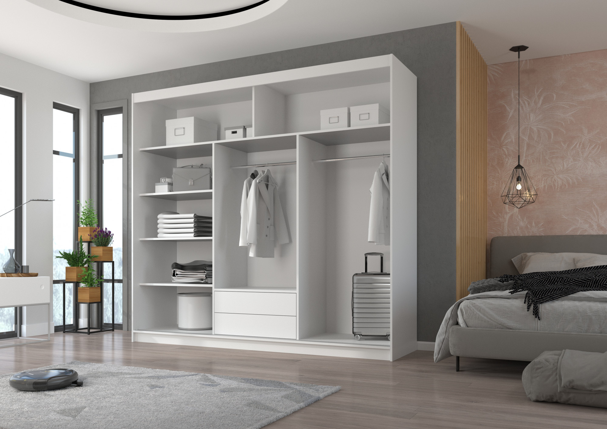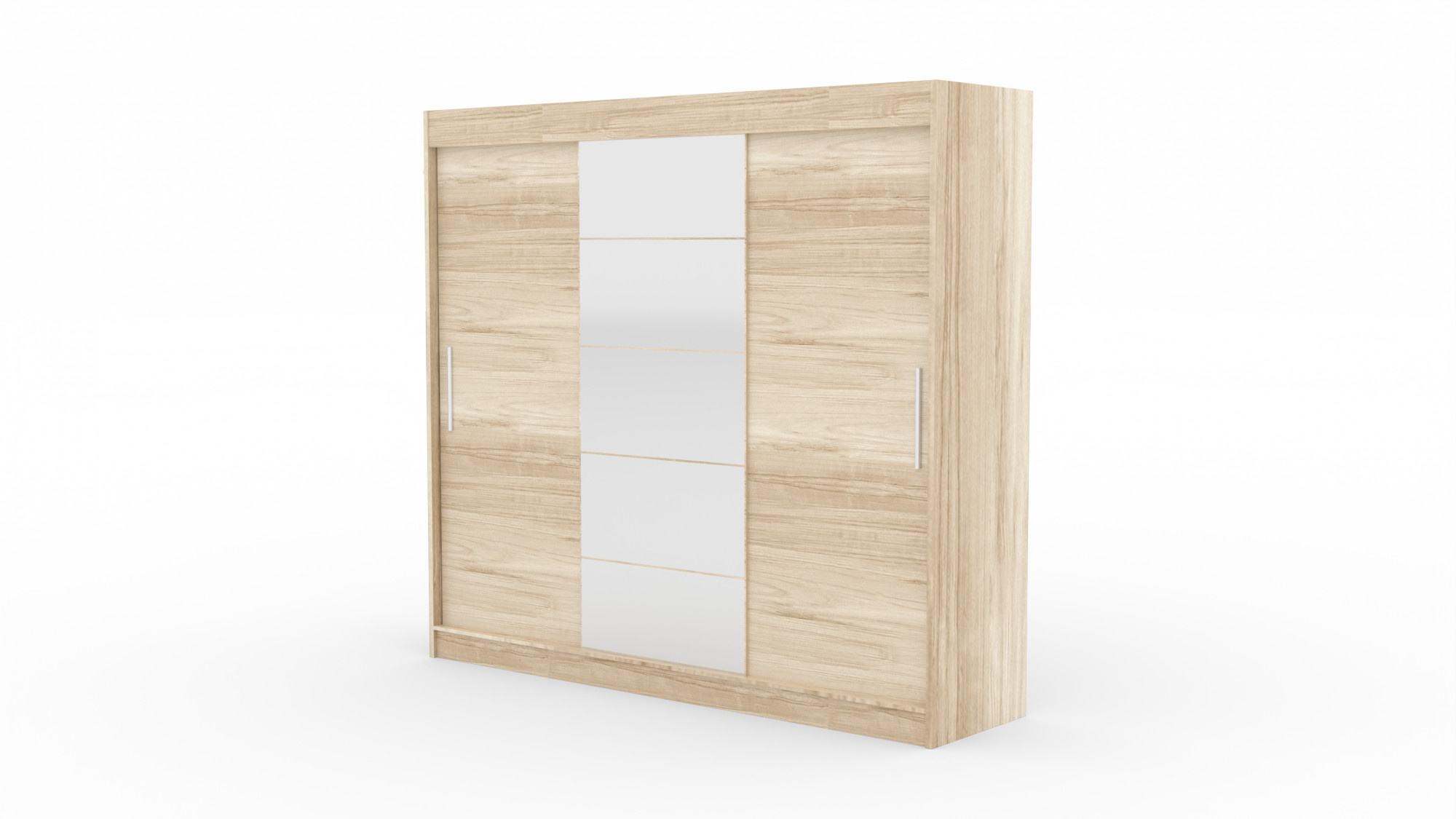 Šatní skříň s posuvnými dveřmi a zrcadlem ERWIN je ideálním způsobem, jak uspořádat prostor. Nábytek je vybaven prostornými policemi a tyčí, na kterou můžete pověsit šaty, obleky, svrchní oděvy nebo košile. Na čelní stranu byla připevněna zrcadla, která opticky zvětšují prostor a dodávají mu kouzelný půvab. Díky tomu, že skříň je posuvná, nemusíte vyčleňovat další místo na otevření dveří, což z ní činí ideální řešení pro malý pokoj nebo úzkou předsíň.
