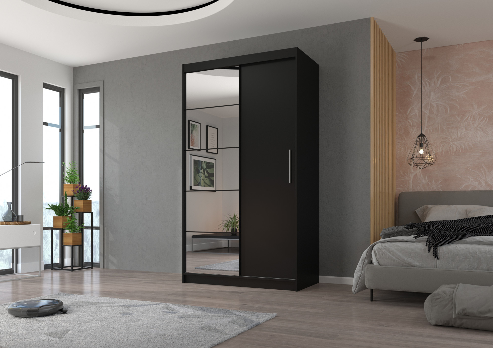 Šatní skříň s posuvnými dveřmi a zrcadlem ESTI je ideálním způsobem, jak uspořádat prostor. Nábytek je vybaven prostornými policemi a tyčí, na kterou můžete pověsit šaty, obleky, svrchní oděvy nebo košile. Na čelní stranu byla připevněna zrcadla, která opticky zvětšují prostor a dodávají mu kouzelný půvab. Díky tomu, že skříň je posuvná, nemusíte vyčleňovat další místo na otevření dveří, což z ní činí ideální řešení pro malý pokoj nebo úzkou předsíň.