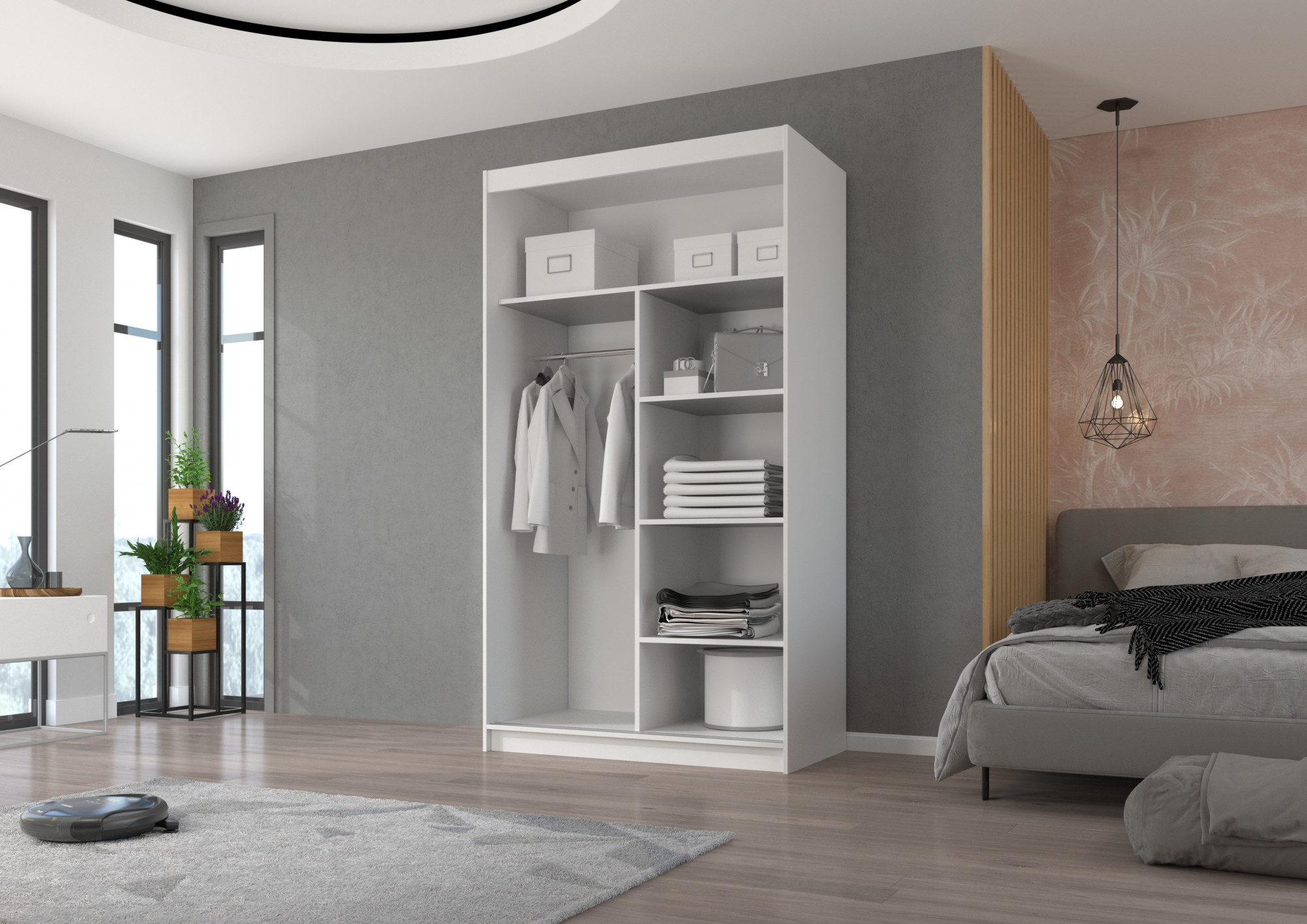 Šatní skříň s posuvnými dveřmi a zrcadlem ESTI je ideálním způsobem, jak uspořádat prostor. Nábytek je vybaven prostornými policemi a tyčí, na kterou můžete pověsit šaty, obleky, svrchní oděvy nebo košile. Na čelní stranu byla připevněna zrcadla, která opticky zvětšují prostor a dodávají mu kouzelný půvab. Díky tomu, že skříň je posuvná, nemusíte vyčleňovat další místo na otevření dveří, což z ní činí ideální řešení pro malý pokoj nebo úzkou předsíň.