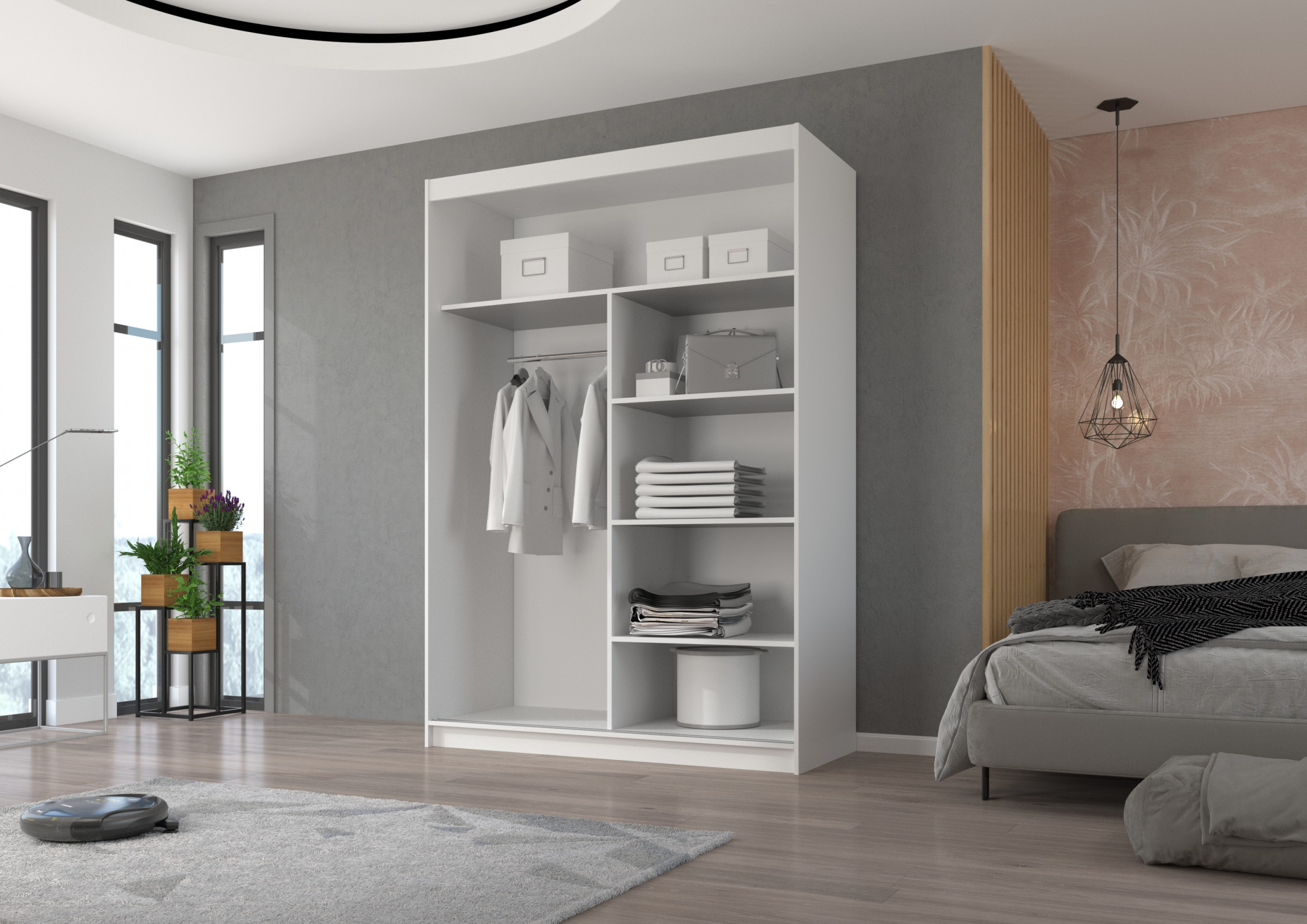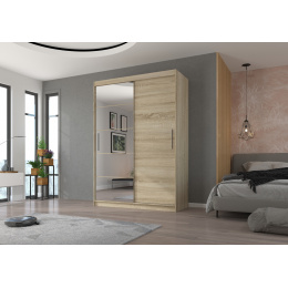 Šatní skříň s posuvnými dveřmi a zrcadlem ESTI je ideálním způsobem, jak uspořádat prostor. Nábytek je vybaven prostornými policemi a tyčí, na kterou můžete pověsit šaty, obleky, svrchní oděvy nebo košile. Na čelní stranu byla připevněna zrcadla, která opticky zvětšují prostor a dodávají mu kouzelný půvab. Díky tomu, že skříň je posuvná, nemusíte vyčleňovat další místo na otevření dveří, což z ní činí ideální řešení pro malý pokoj nebo úzkou předsíň.