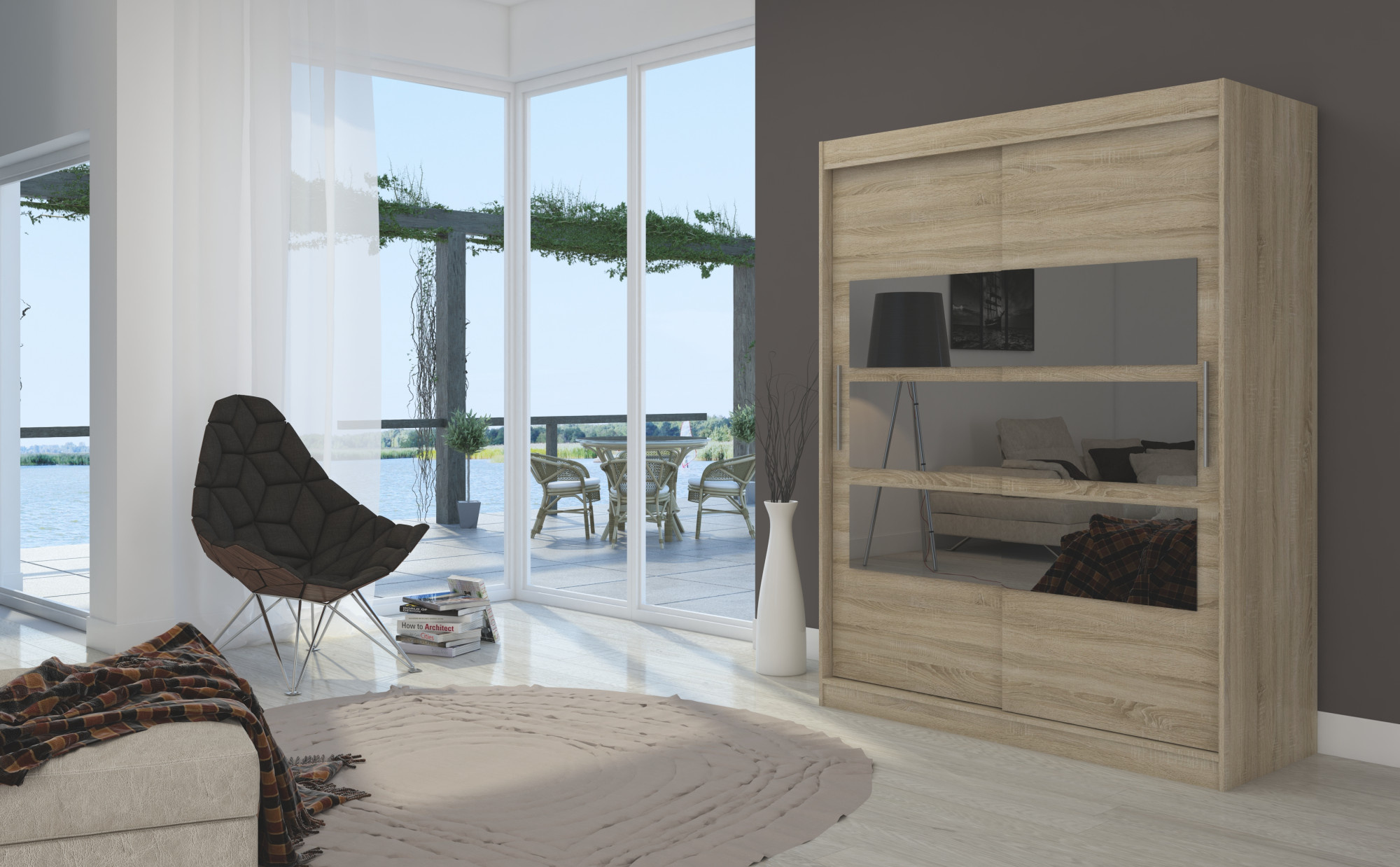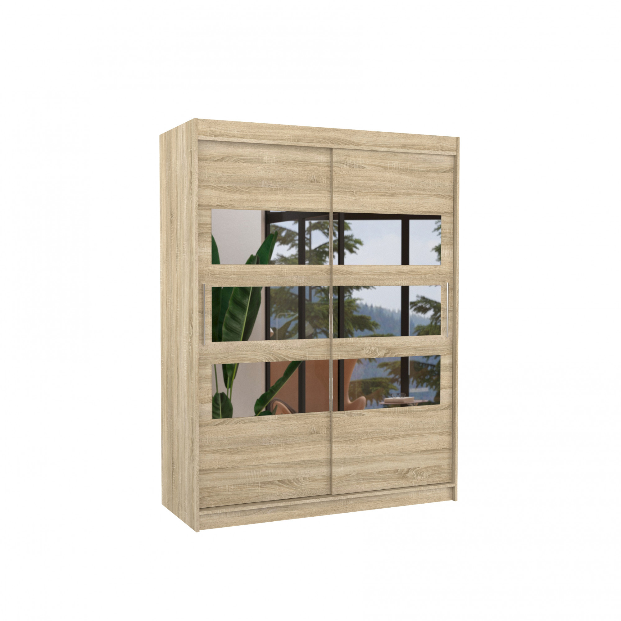 Šatní skříň s posuvnými dveřmi a zrcadlem FLORENTO je ideálním způsobem, jak uspořádat prostor. Nábytek je vybaven prostornými policemi a tyčí, na kterou můžete pověsit šaty, obleky, svrchní oděvy nebo košile. Na čelní straně byla připevněna horizontální zrcadla, která opticky zvětšují prostor a zároveň dodávají jedinečný styl. Díky tomu, že skříň je posuvná, nemusíte vyčleňovat další místo na otevření dveří, což z ní činí ideální řešení pro malý pokoj nebo úzkou předsíň.