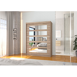 Posuvná skříň se zrcadlem MURANI je ideálním způsobem, jak uspořádat prostor. Nábytek je vybaven prostornými policemi a tyčí, na kterou můžete pověsit šaty, obleky, svrchní oděvy nebo košile. Na čelní straně byla připevněna kouřová zrcadla, která opticky zvětšují prostor a zároveň dodávají eleganci. Díky tomu, že skříň je posuvná, nemusíte vyčleňovat další místo na otevření dveří, což z ní činí ideální řešení pro malý pokoj nebo úzkou předsíň.