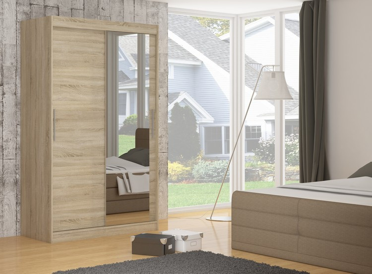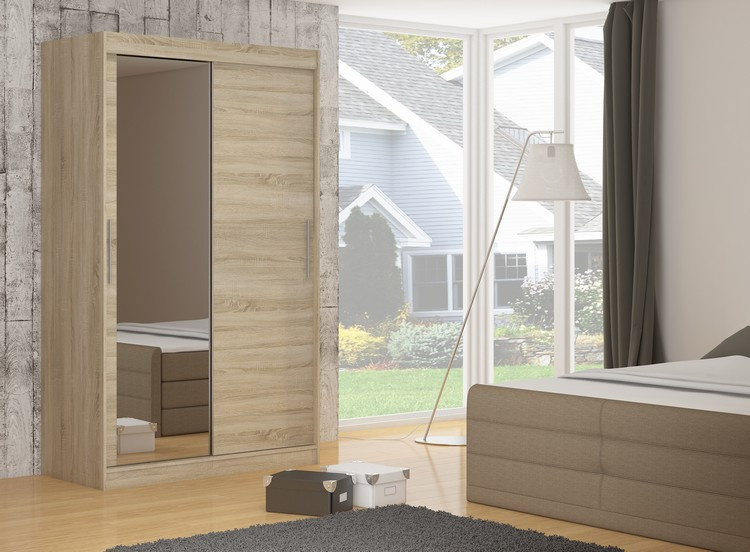 Šatní skříň s posuvnými dveřmi a zrcadlem TOM je ideálním způsobem, jak uspořádat prostor. Nábytek je vybaven prostornými policemi a tyčí, na kterou můžete pověsit šaty, obleky, svrchní oděvy nebo košile. Na čelní straně bylo připevněno zrcadlo, které opticky zvětšuje prostor. Díky tomu, že skříň je posuvná, nemusíte vyčleňovat další místo na otevření dveří, což z ní činí ideální řešení pro malý pokoj nebo úzkou předsíň.