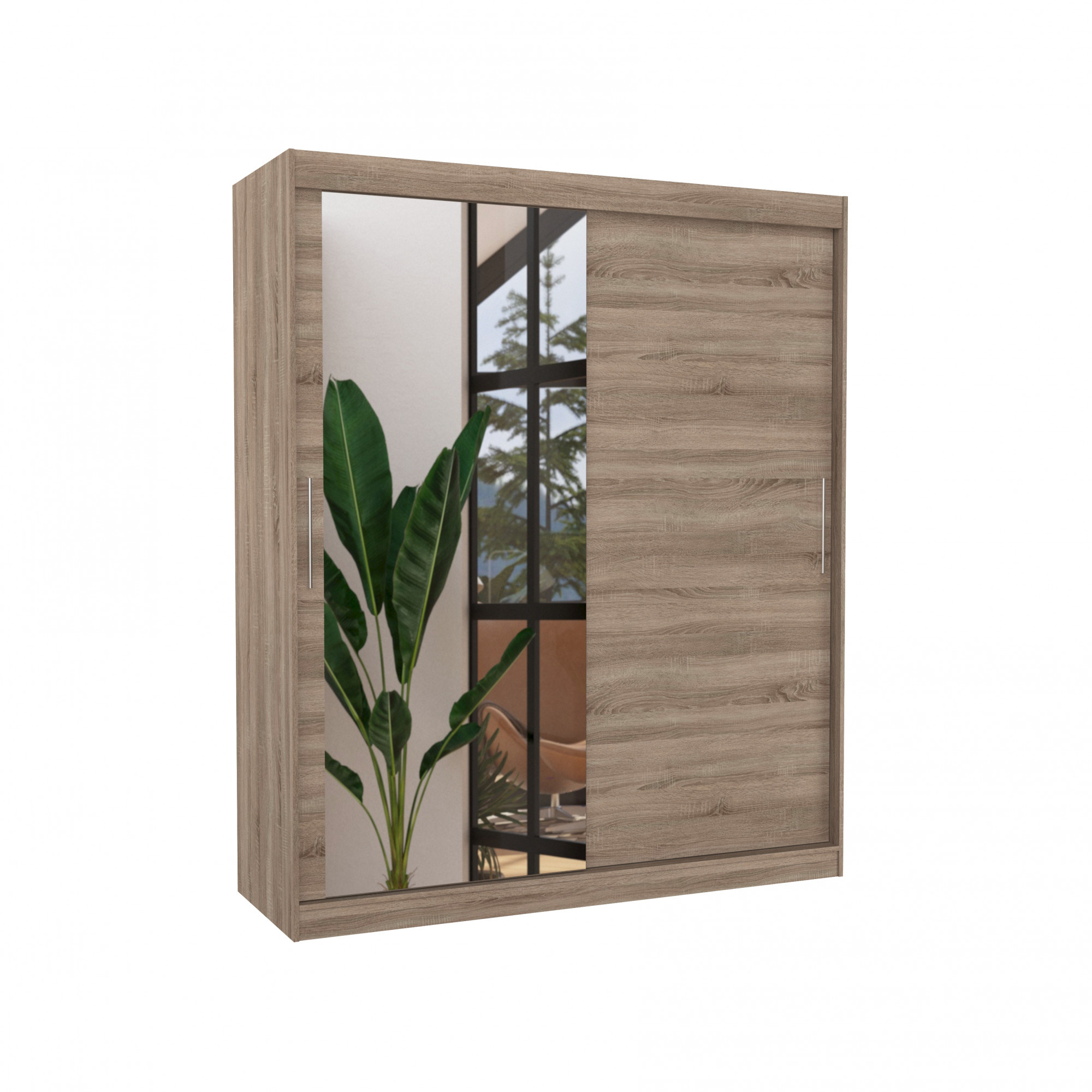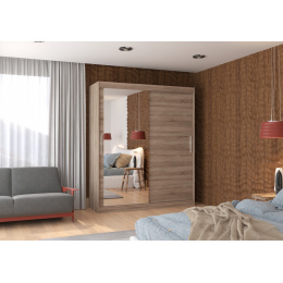 Šatní skříň s posuvnými dveřmi a zrcadlem TOM je ideálním způsobem, jak uspořádat prostor. Nábytek je vybaven prostornými policemi a tyčí, na kterou můžete pověsit šaty, obleky, svrchní oděvy nebo košile. Na čelní straně bylo připevněno zrcadlo, které opticky zvětšuje prostor. Díky tomu, že skříň je posuvná, nemusíte vyčleňovat další místo na otevření dveří, což z ní činí ideální řešení pro malý pokoj nebo úzkou předsíň.
