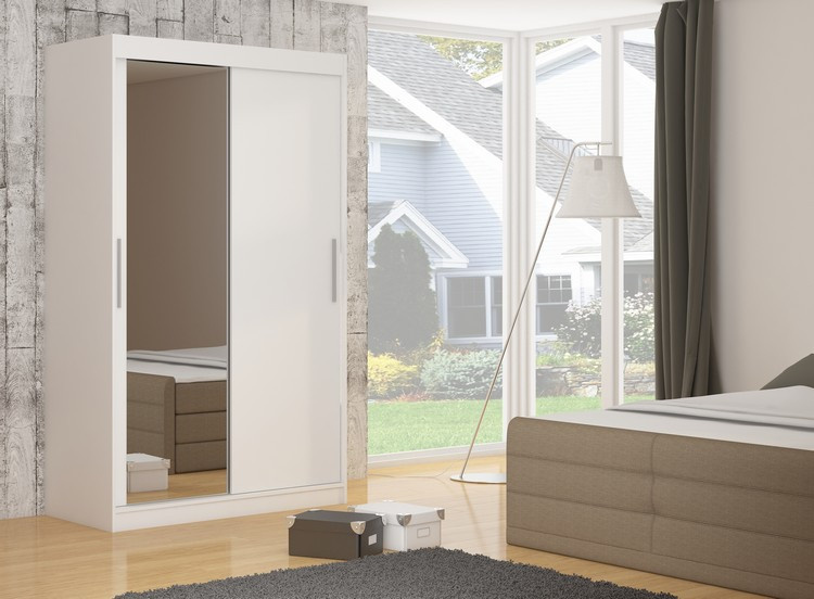 Šatní skříň s posuvnými dveřmi a zrcadlem TOM je ideálním způsobem, jak uspořádat prostor. Nábytek je vybaven prostornými policemi a tyčí, na kterou můžete pověsit šaty, obleky, svrchní oděvy nebo košile. Na čelní straně bylo připevněno zrcadlo, které opticky zvětšuje prostor. Díky tomu, že skříň je posuvná, nemusíte vyčleňovat další místo na otevření dveří, což z ní činí ideální řešení pro malý pokoj nebo úzkou předsíň.